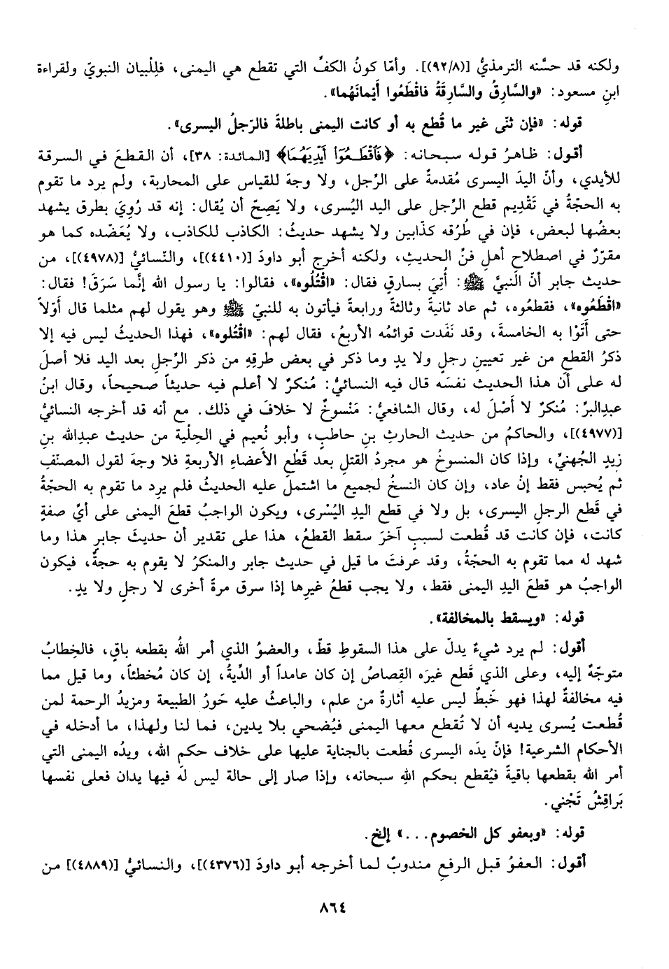 ولكنه حسنه الترمذي وأما كون الكف التي تقطع هي اليمنى فللبيان النبوي ولقراءة ابن مسعود {وَالسَّارِقُ وَالسَّارِقَةُ فَاقْطَعُوا أَيْدِيَهُمَا}