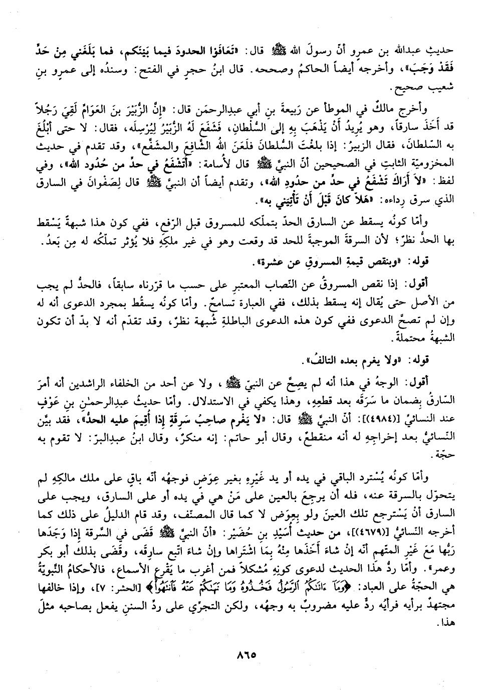 أقول: الوجه في هذا أنه لم يصح عن النبي صلى الله عليه وسلم ولا عن أحد من الخلفاء الراشدين أنه أمر السارق بضمان ما سرقه بعد قطعه وهذا يكفي في الاستدلال وأما حديث عبد الرحمن بن عوف عند النسائي أن النبي صلى الله عليه وسلم قال: "لا يغرم صاحب سرقة إذا أقيم عليه الحد"، فقد بين النسائي "4984"، بعد إخراجه له أنه منقطع وقال أبو حاتم إنه منكر وقال ابن عبد البر لا تقوم به حجة.