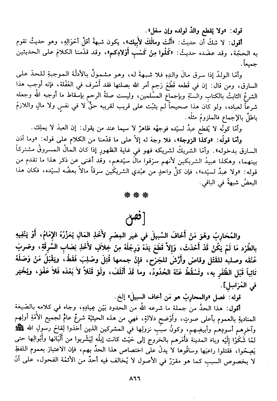 وأما الولد إذا سرق مال والده فلا شبهة له وهو مشمول بالأدلة الموجبة للحد على السارق ومن قال إن في قطعه قطع رحم أمر الله بعلتها فقد أسرف في الغفلة فإنه أوجب هذا الشرع الثابت بالكتاب والسنة وبإجماع المسلمين وليست صلة الرحم بإسقاط ما أوجبه الله وجعله شرعا لعباده ولو كان هذا صحيحا لم يثبت على قريب لقريبه حق لا في نفس ولا مال واللازم باطل بالإجماع فالملزوم مثله.
