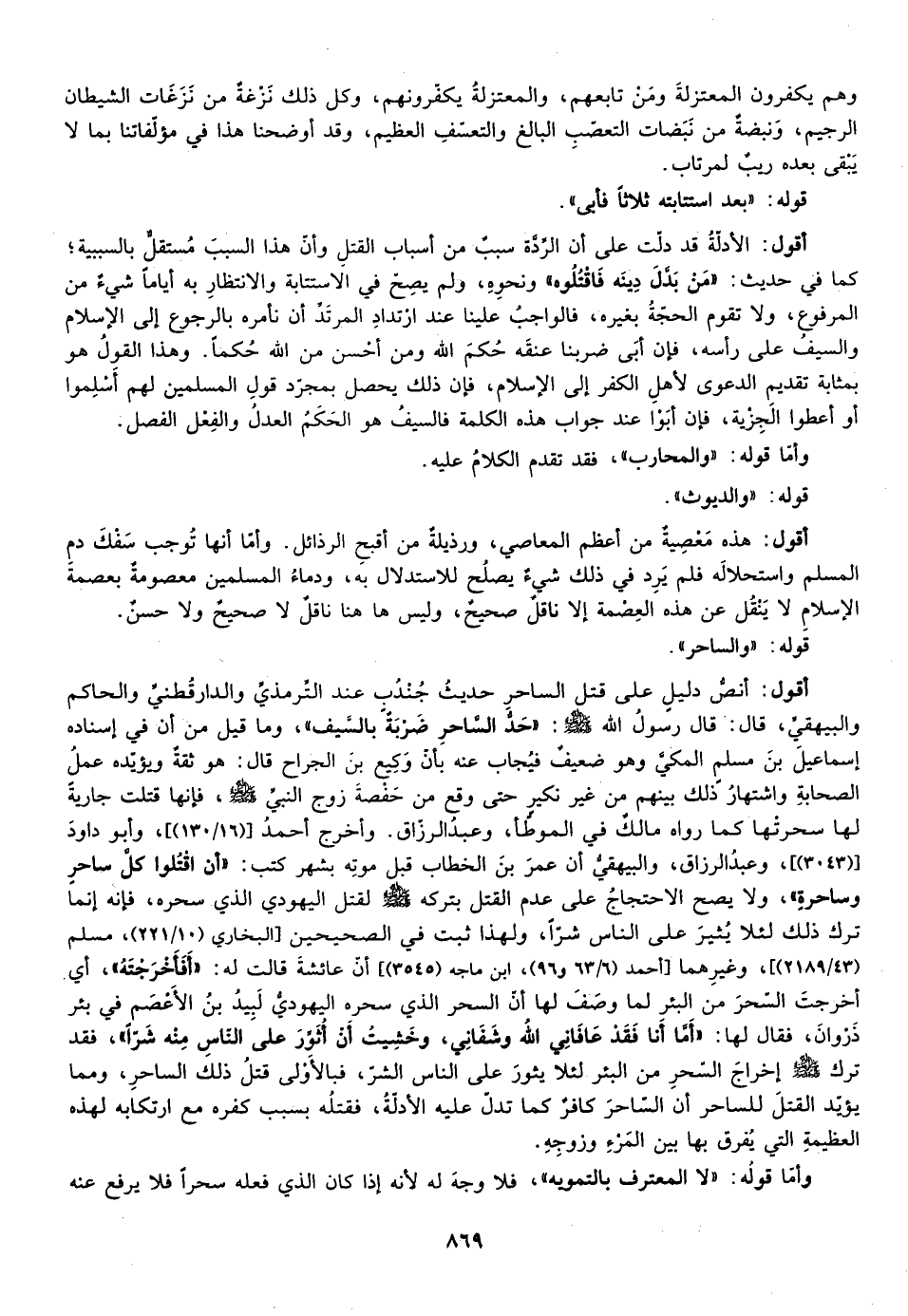 أقول: أنص دليل على قتل الساحر حديث جندب عند الترمذي والدارقطني والحاكم والبيهقي قال قال رسول الله صلى الله عليه وسلم: "حد الساحر ضربة بالسيف"، وما قيل من أن في إسناده اسماعيل بن مسلم المكي وهو ضعيف فيجاب عنه بأن وكيع بن الجراح قال هو ثقة ويؤيده عمل الصحابة واشتهار ذلك بينهم من غير نكير حتى وقع من حفصة زوج النبي صلى الله عليه وسلم فإنها قتلت جارية لها سحرتها كما رواه مالك في الموطأ وعبد الرزاق وأخرج أحمد وأبو داود وعبد الرزاق والبيهقي أن عمر بن الخطاب قبل موته بشهر كتب أن اقتلوا كل ساحر وساحرة ولا يصح الاحتجاج على عدم القتل بتركة صلى الله عليه وسلم للقتل لليهودي الذي سحره فإنه إنما ترك ذلك لئلا يثير على الناس شرا ولهذا ثبت في الصحيحين [البخاري "10/221"، مسلم "43/2189"] ، وغيرهما [أحمد "6/63، 96"، ابن ماجة "3545"، أن عائشة قالت له: "أفأخرجته" أي أخرجت السحر من البئر لما وصف لها أن الساحر الذي سحره اليهودي لبيد بن الأعصم في بئر ذروان فقال لها: "أما أنا فقد عافاني الله وشفاني وخشيت أن أثور على الناس منه شرا" فقد ترك صلى الله عليه وسلم إخراج السحر من البئر لئلا يثور على الناس الشر فبالأولى قتل ذلك الساحر ومما يؤيد القتل للساحر أن الساحر كافر كما تدل عليه الأدلة فقتله بسبب كفره مع ارتكابه لهذه العظيمة التي يفرق بها بين المرء وزوجه.