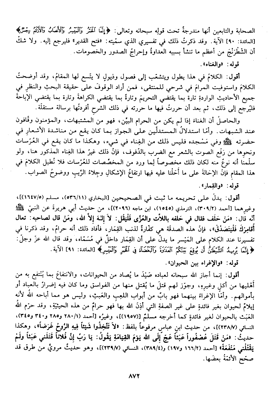 الصحابة والتابعين أنها مندرجة تحت قوله سبحانه وتعالى: {إِنَّمَا الْخَمْرُ وَالْمَيْسِرُ وَالْأَنْصَابُ وَالْأَزْلامُ رِجْسٌ} [المائدة: 90] ، الآية وقد ذكرت ذلك في تفسيري الذي سميته فتح القدير فليرجع إليه ولا شك أن الشطرنج من أعظم ما ينشأ عنه العداوة وإحراج الصدور والخصومات.