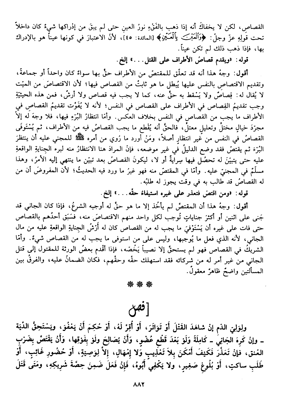 أقول: وجه هذا أن المقتص لم يأخذ إلا ما هو حق له أوجبه الشرع فإذا كان الجاني قد جنى على اثنين أو أكثر جنايات توجب لكل واحد منهم الاقتصاص منه فسبق أحدهم بالقصاص حتى فات على غيره أن يستوفي ما يجب له من القصاص كان له أرش الجناية الواقعة عليه من مال الجاني لأنه الذي فعل ما يوجبها وليس على من استوفى ما يجب له من القصاص شيء وأما الشريك في القصاص فهو لم يستحق إلا نصيبا يخصه فإذا أقدم بعض الورثة للمقتول إلى قتل الجاني من غير أمر له من شركائه فقد استهلك حقه وحقهم فكان الضمان عليه والفرق بين المسألتين واضح ظاهر معقول.