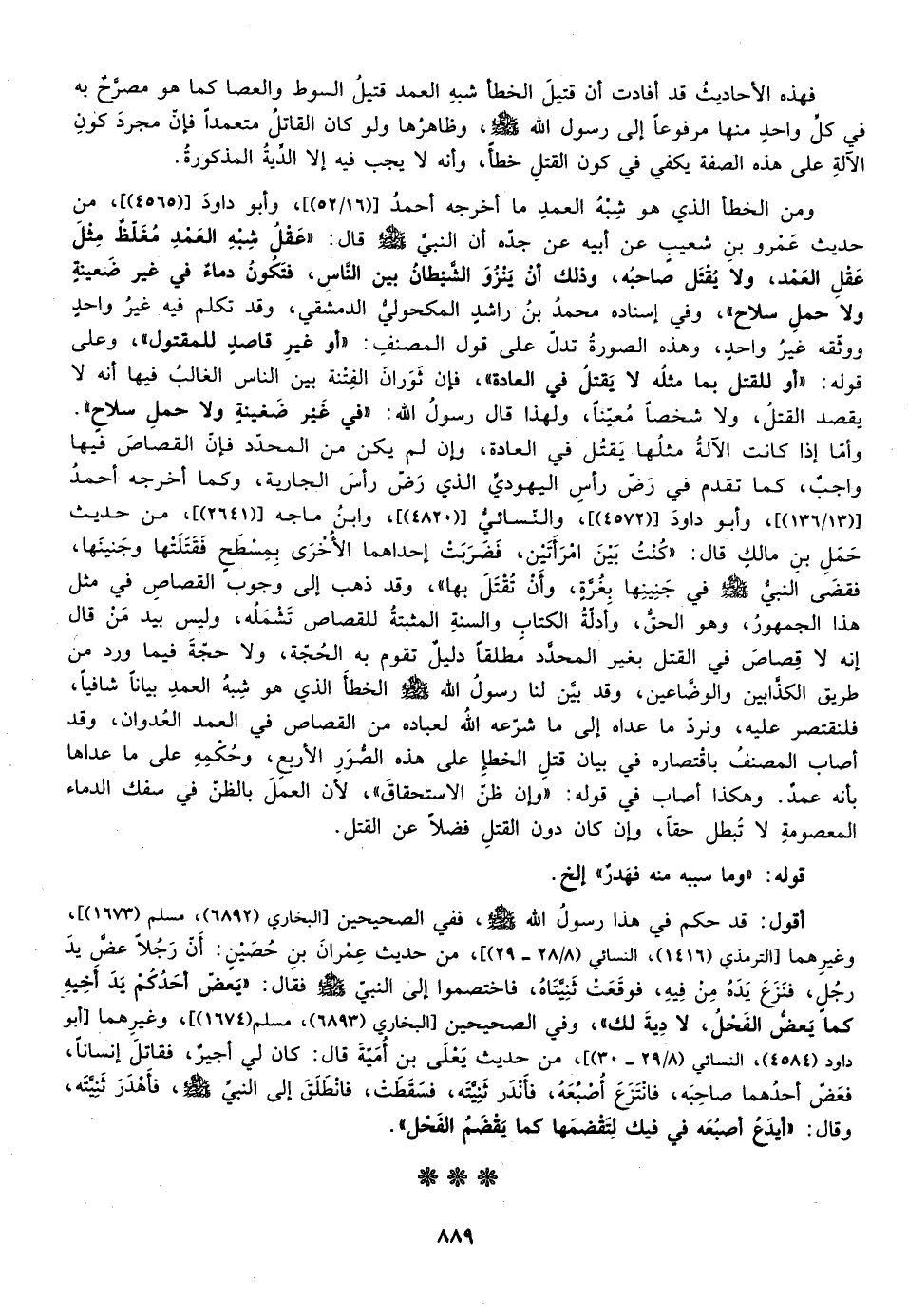 ومن الخطأ الذي هو شبه العمد ما أخرجه أحمد وأبو داود من حديث عمرو بن شعيب عن أبيه عن جده أن النبي صلى الله عليه وسلم قال: "عقل شبه العمد مغلظ مثل عقل العمد ولا يقتل صاحبه وذلك أن ينزو الشيطان بين الناس فتكون دماء في غير ضغينة ولا حمل السلاح"، وفي إسناده محمد بن راشد المكحولي الدمشقي وقد تكلم فيه غير واحد ووثقه غير واحد وهذه الصورة تدل على قول المصنف أو غير قاصد للمقتول وعلى قوله أو للقتل لما مثله لا يقتل في العادة فإن ثوران الفتنة بين الناس الغالب فيها أنه لا يقصد القتل ولا شخصا معينا ولهذا قال رسول الله: "في غير ضغينة ولا حمل سلاح" وأما إذا كانت الآلة مثلها يقتل في العادة وإن لم يكن من المحدد فإن القصاص فيها واجب كما تقدم في رض رأس اليهودي الذي رض رأس الجارية وكما أخرجه أحمد "13/136"، وأبو داود "4572"، والنسائي "4820"، وابن ماجه "2641"، من حديث حمل بن مالك قال" كنت بين امرأتين فضربت إحداهما الأخرى بمسطح فقتلتها وجنينها فقضى النبي صلى الله عليه وسلم في جنينها بغرة وأن تقتل بها وقد ذهب إلى وجوب القصاص في مثل هذا الجمهور وهو الحق وأدلة الكتاب والسنة المثبتة للقصاص تشمله وليس بيد من قال إنه لا قصاص في القتل بغير المحدد مطلقا دليل تقوم به الحجة ولا حجة فيما ورد من طريق الكذابين والوضاعين وقد بين لنا رسول الله صلى الله عليه وآله وسلم الخطأ الذي هو شبه العمد بيانا شافيا فلنقتصر عليه ونرد ما عداه إلى ما شرعه الله لعباده من القصاص في العمد العدوان وقد أصاب المصنف باقتصاره في بيان قتل الخطأ على هذه الصور الأربع وحكمه على ما عداها بأنه عمد وهكذا أصاب في قوله وإن ظن الاستحقاق لأن العمل بالظن في سفك الدماء المعصومة لا تبطل حقا وإن كان دون القتل فضلا عن القتل.