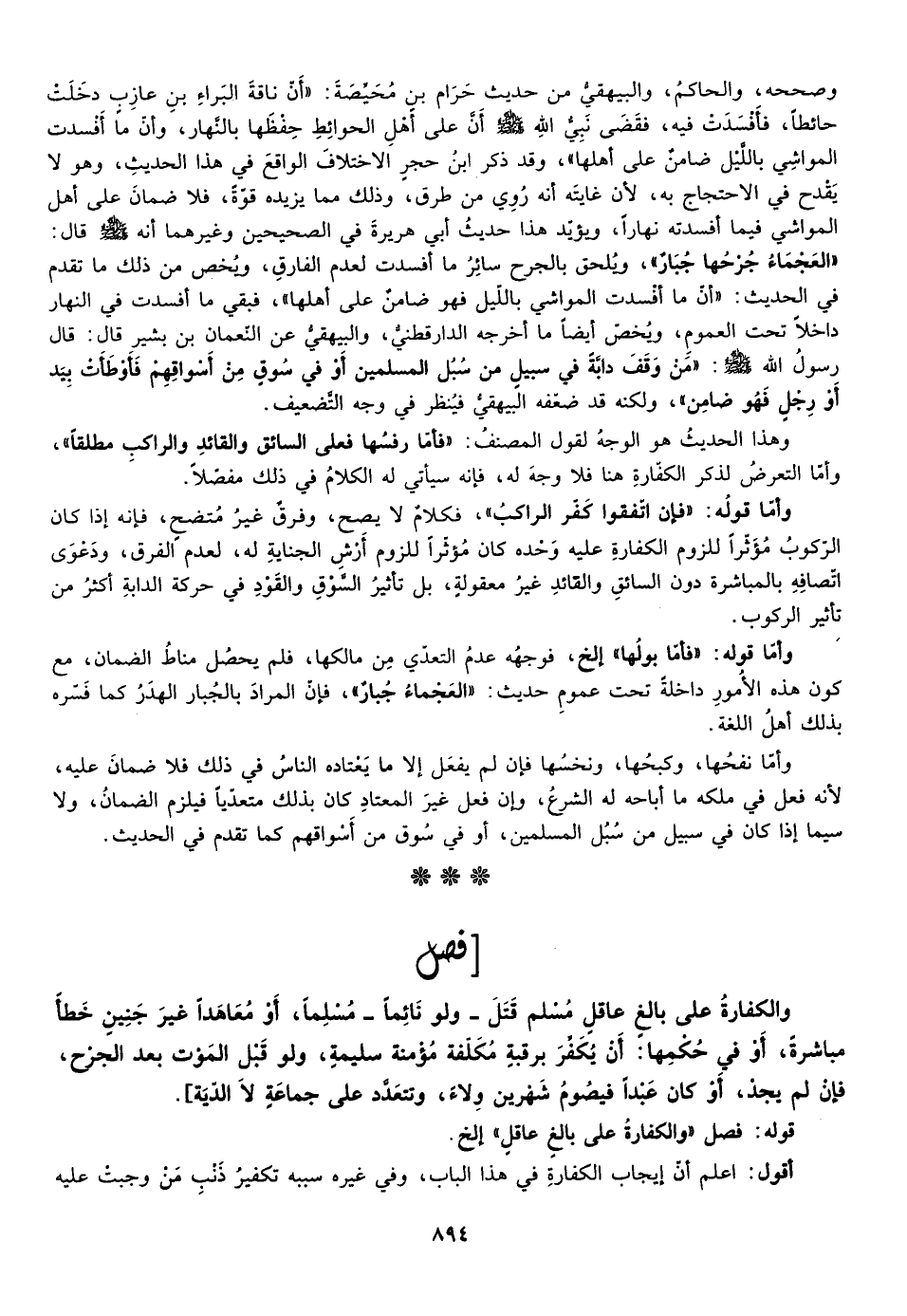 وهذا الحديث هو الوجه لقول المصنف: "فأما رفسها فعلى السائق والقائد والراكب مطلقا" وأما التعرض لذكر الكفارة هنا فلا وجه له فإنه سيأتي له الكلام في ذلك مفصلا.