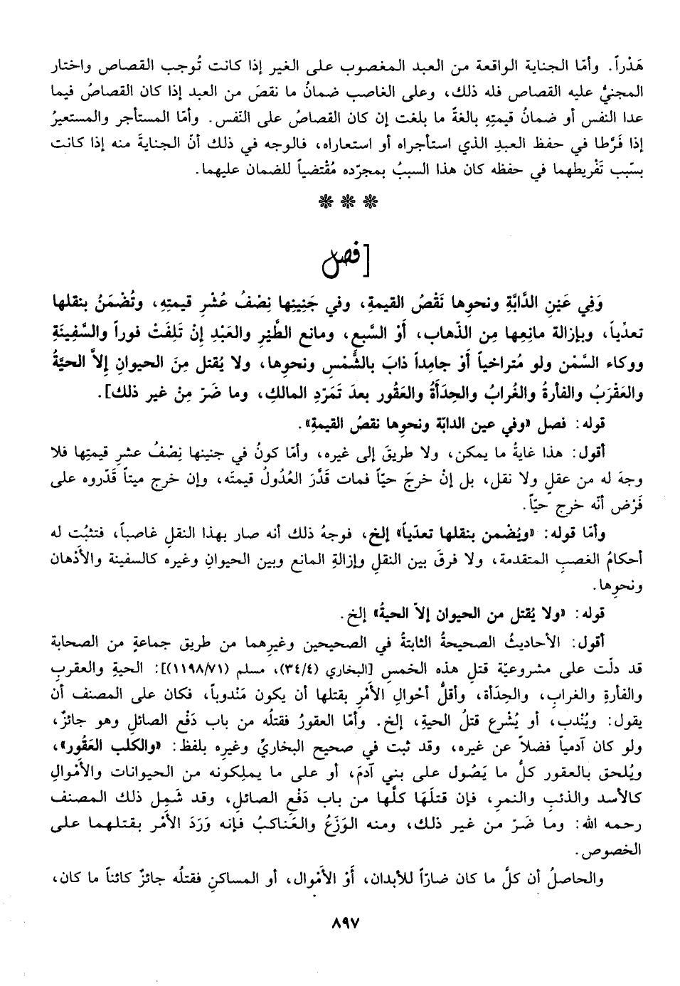 وفي عين الدابة ونحوها نقص القيمة وفي جنينها نصف عشر قيمته وتضمن بنقلها تعديا وبازالة مانعها من الذهاب أو السبع ومانع الطير والعبد إن تلفت فورا والسفينة ووكإ السمن ولو متراخيا أو جامدا ذاب بالشمس ونحوها ولا يقتل من الحيوان إلا الحية والعقرب والفأرة والغراب والحدأة والعقور بعد تمرد المالك وما ضر من غير ذلك] .
