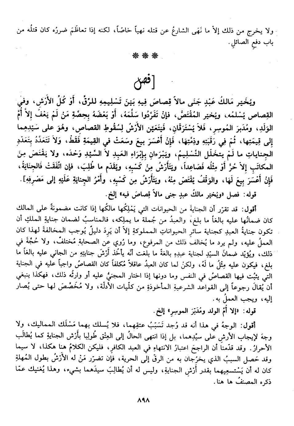 ويخير مالك عبد جنى ما لا قصاص فيه بين تسليمه للرق أوكل الأرش وفي الصقاص يسلمه ويخير المقتص فإن تفردوا سلمه أو بعضه بحصة من لم يعف إلا أم الولد ومدبر الموسر فلا يسترقان فيتعين الأرش لسقوط القصاص وهو على سيدهما إلى قيمتهما ثم في رقبته وذمتها فإن أعسر بيع وسعت في القيمة فقط ولا تتعدد بتعدد الجنايات ما لم يتخلل التسليم ويبرآن بإبراء العبد لا السيد وحده ولا يقتص من المكاتب إلا حر أو مثله فصاعدا ويتأرش من كسبه ويقدم ما طلب فإن اتفقت فالجناية فإن أعسر بيع لها والوقف يقتص منه ويتأرش من كسبه وأمر الجناية عليه إلى مصرفه] .