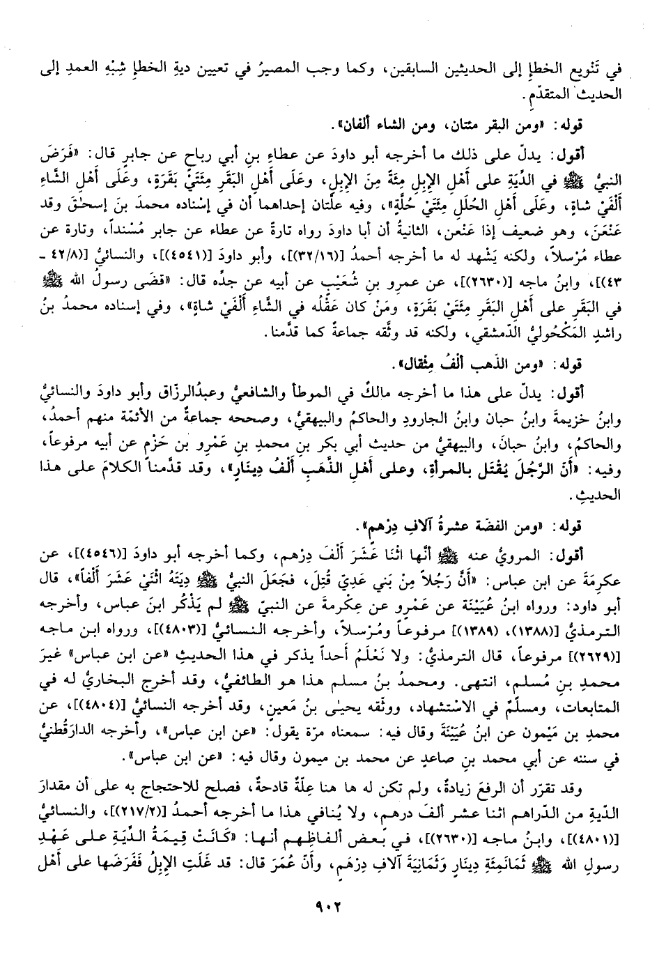 أقول: يدل على ذلك ما أخرجه أبو داود عن عطاء بن أبي رباح عن جابر قال فرض النبي صلى الله عليه وسلم في الدية على أهل الإبل مائة من الإبل وعلى أهل البقر مائتي بقرة وعلى أهل الشاء ألفي شاة وعلى أهل الحلل مائتي حلة وفيه علتان إحداهما أن في إسناده محمد بن إسحاق وقد عنعن وهو ضعيف إذا عنعن الثانية أن أبا داود رواه تارة عن عطاء عن جابر مسندا وتارة عن عطاء مرسلا ولكنه يشهد له ما أخرجه أحمد ["16/32"، وأبو داود "45441"، والنسائي "8/42،43"، وابن ماجه "2630"] ، عن عمرو بن شعيب عن أبيه عن جده قال: قضى رسول الله أن من كان عقله في البقر على أهل البقر مائتي بقرة ومن كان عقله في الشاء ألفي شاة، وفي إسناده محمد بن راشد المكحولي الدمشقي ولكنه قد وثقه جماعة كما قدمنا.