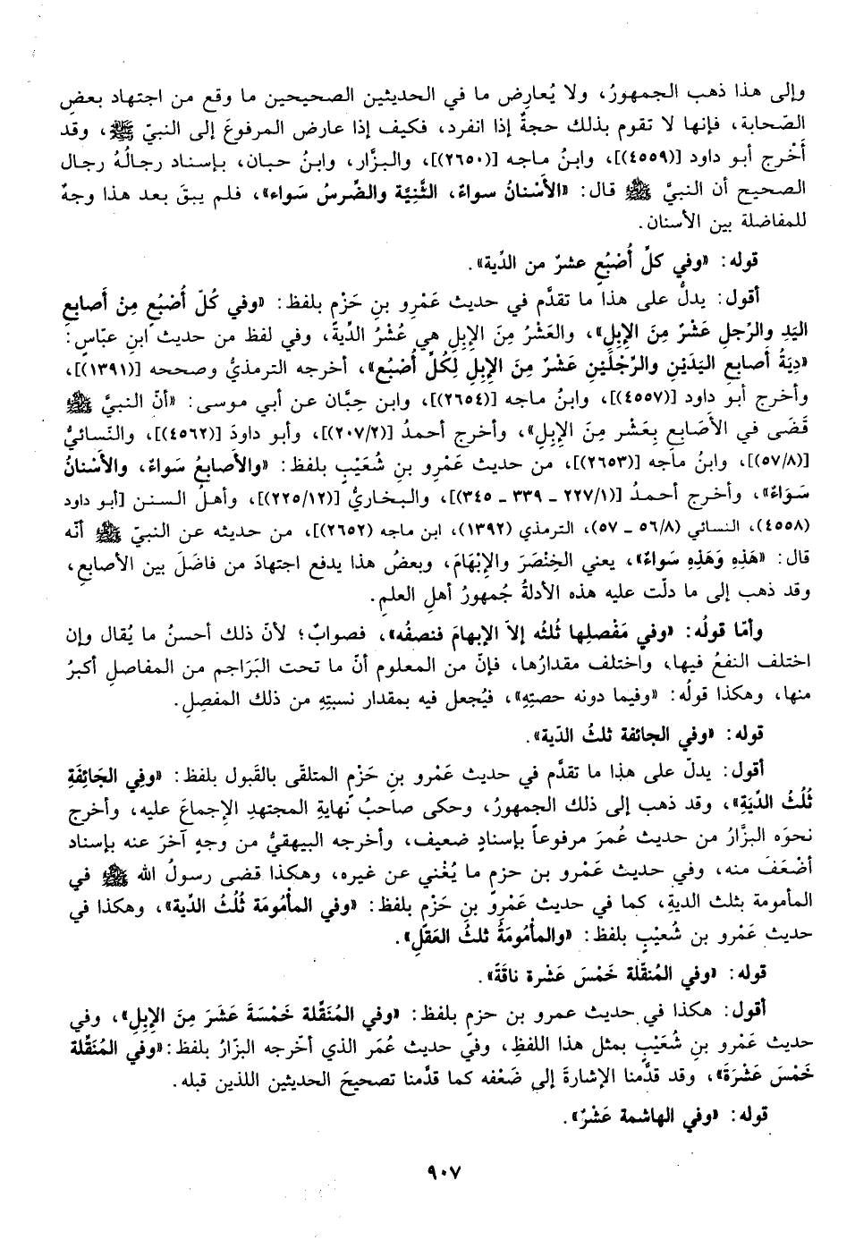 أقول: يدل على هذا ما تقدم في حديث عمرو بن حزم المتلقي بالقبول بلفظ: "وفي الجائفة ثلث الدية" وقد ذهب إلى ذلك الجمهور وحكى صاحب نهاية المجتهد الإجماع عليه وأخرج نحوه البزار من حديث عمر مرفوعا بإسناد ضعيف وأخرجه البيهقي من وجه آخر عنه بإسناد أضعف منه وفي حديث عمرو بن حزم ما يغني عن غيره وهكذا قضى رسول الله صلى الله عليه وسلم في المأمومة بثلث الدية كما في حديث عمرو بن حزم بلفظ: "وفي المأمومة ثلث الدية"، وهكذا في حديث عمرو بن شعيب بلفظ: "والمأمومة ثلث العقل".