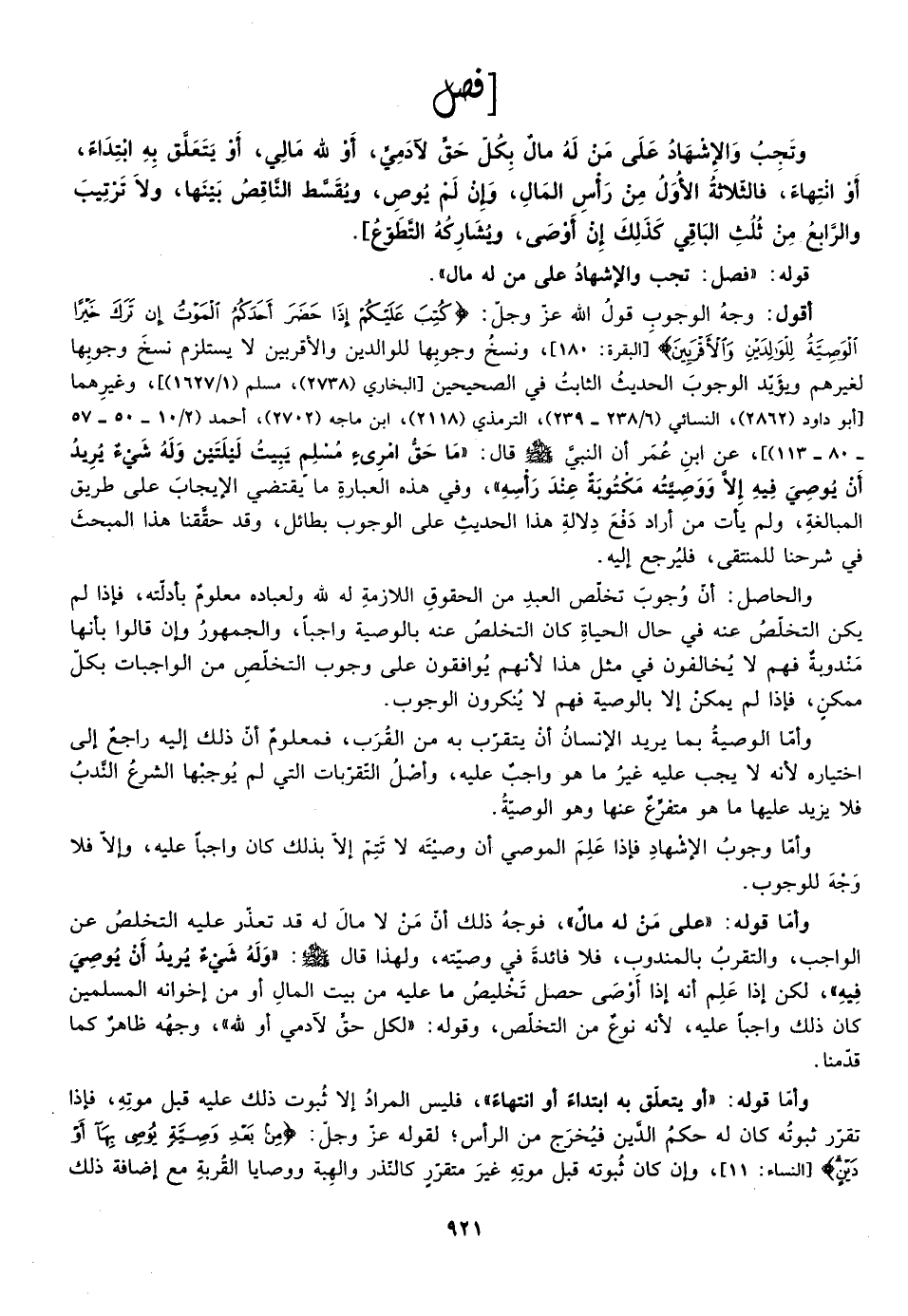 أقول: وجه الوجوب قول الله عزوجل: {كُتِبَ عَلَيْكُمْ إِذَا حَضَرَ أَحَدَكُمُ الْمَوْتُ إِنْ تَرَكَ خَيْراً الْوَصِيَّةُ لِلْوَالِدَيْنِ وَالْأَقْرَبِينَ} [النساء: 180] ، لا يستلزم نسخ وجوبها لغيرهم ويؤيد الوجوب الحديث الثابت في الصحيحين [البخاري "2738"، مسلم ط1/1627"، وغيرهما أبو داود "2862"، النسائي "6/238، 239"، الترمذي "2118"، ابن ماجة "2702"، أحمد "2/10، 50، 57، 80، 113"] ، عن ابن عمر أن النبي صلى الله عليه وسلم قال: "ما حق امرىء مسلم يبيت ليلتين وله شيء يريد أن يوصي فيه إلا ووصيته مكتوبة عند رأسه"، وفي هذه العبارة ما يقتضي الإيجاب على طريق المبالغة ولم يأت من أراد دفع دلالة هذا الحديث على الوجوب بطائل وقد حققنا هذا المبحث في شرحنا للمنتقي فليرجع إليه.