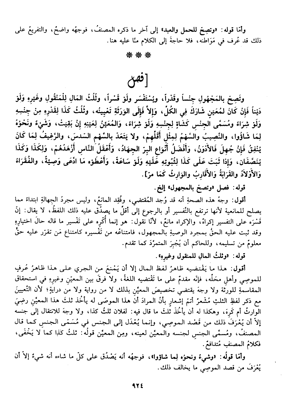 وتصح بالمجهول جنسا وقدرا ويستفسر ولو قسرا وثلث المال للمنقول وغيره ولو دينا فإن كان لمعين شارك في الكل وإلا فإلى الورثة تعيينه وثلث كذا لقدره من جنسه ولو شراء ومسمى الجنس كشاة لجنسه ولو شراء والمعين لعينه إن بقيت وشيء ونحوه لما شاءوا والنصيب والسهم لمثل أقلهم ولا يتعد بالسهم السدس والرغيف لما كان ينفق فإن جهل فالأدون وأفضل أنواع البر الجهاد وأعقل الناس أزهدهم ولكذا وكذا ينصفان وإذا ثبت على كذا لثبوته عليه ولو ساعة وأعطوه ما ادعى وصية والفقراء والأولاد والقرابة والأقارب والوارث كما مر] .