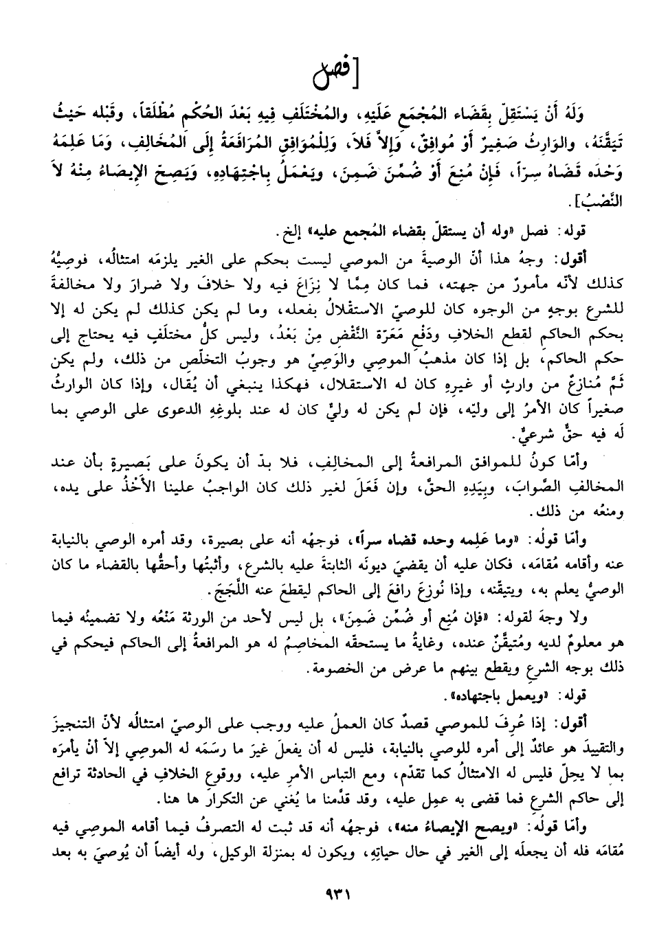أقول: وجه هذا أن الوصية من الموصي ليست بحكم على الغير يلزمه امتثاله فوصية كذلك لأنه مأمور من جهته فما كان مما لا نزاع فيه ولا خلاف ولا ضرار ولا مخالفة للشرع بوجه من الوجوه كان للوصي الإستقلال بفعله وما لم يكن كذلك لم يكن له إلا بحكم الحاكم لقطع الخلاف ودفع معرة النقض من بعد وليس كل مختلف فيه يحتاج إلى حكم الحاكم بل إذا كان مذهب الموصي والوصي هو وجوب التخلص من ذلك ولم يكن ثم منازع من وارث أو غيره كان له الإستقلال فهكذا ينبغي أن يقال وإذا كان الوارث صغيرا كان الأمر إلى وليه فإن لم يكن له ولي كان له عند بلوغه الدعوى على الوصي بماله فيه حق شرعي.