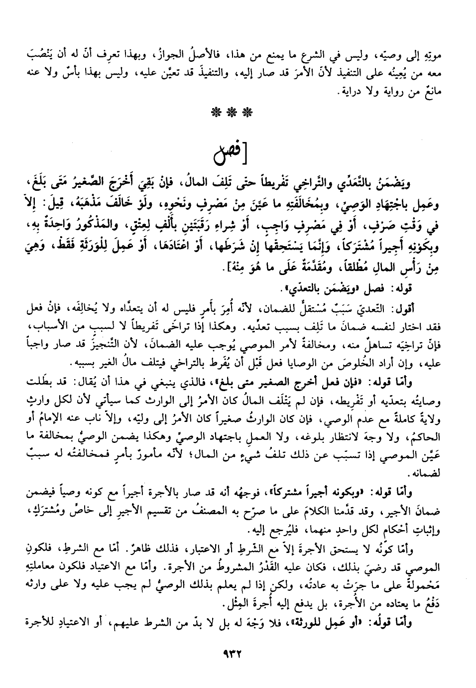 ويضمن بالتعدي والتراخي تفريطا حتى تلف المال فإن بقي أخرج الصغير متى بلغ وعمل باجتهاد الوصي وبمخالفته ما عين من مصرف ونحوه ولو خالف مذهبه قيل إلا في وقت صرف أو في مصرف واجب أو شراء رقبتين بألف لعتق والمذكور واحدة به وبكونه أجيرا مشتركا وإنما يستحقها إن شرطها أو اعتادها أو عمل للورثة فقط وهي من رأس المال مطلقا ومقدمة على ما هو منه] .