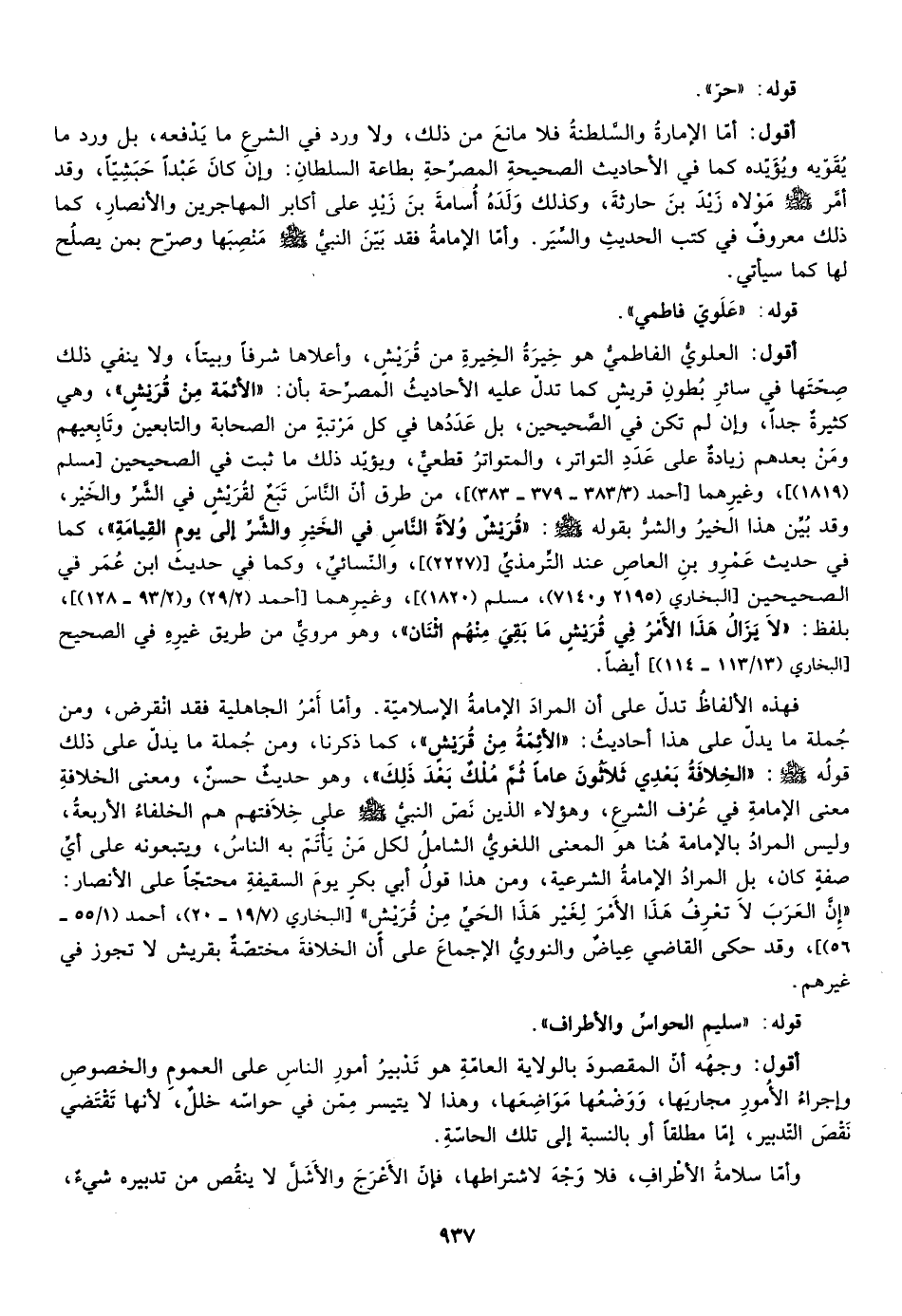 أقول: العلوي الفاطمي هو خيرة الخيرة من قريش وأعلاها شرفا وبيتا ولا ينفي ذلك صحتها في سائر بطون قريش كما تدل عليه الأحاديث المصرحة بأن: "الأئمة من قريش" وهي كثيرة جدا وإن لم تكن في الصحيحين بل عددها في كل مرتبة من الصحابة والتابعين وتابعيهم ومن بعدهم زيادة على عدد المتواتر والمتواتر قطعي ويؤيد ذلك ما ثبت في الصحيحين [مسلم 1819"، وغيرهما أحمد "3/383، 379، 383"] ، من طرق أن الناس تبع لقريش في الشر والخير وقد بين هذا الخير والشر بقوله صلى الله عليه وسلم: "قريش ولاة الناس في الخير والشر إلى يوم القيامة"، كما في حديث عمرو بن العاص عند الترمذي "2227"، والنسائي وكما في حديث ابن عمر في الصحيحين [البخاري "2195، 7140"، مسلم "1820"، وغيرهما أحمد "2/29، 2/93، 128"] ، بلفظ: "لا يزال هذا الأمر في قريش ما بقي منهم اثنان"، وهو مروي من طريق غيره في الصحيح [البخاري "13/113، 114"] ، أيضا.