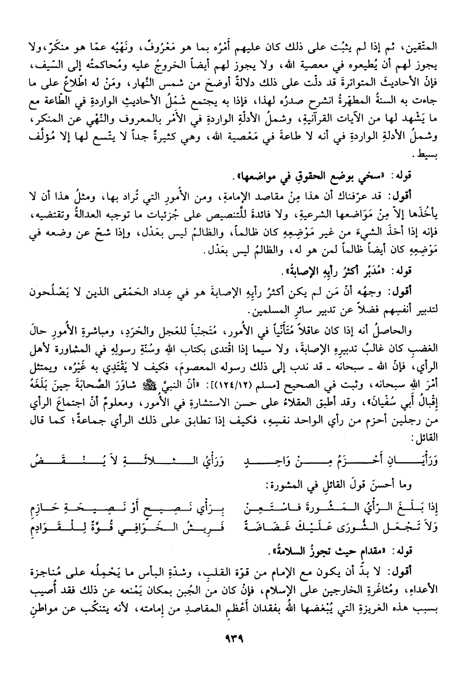 المتقين ثم إذا لم يثبت على ذلك كان عليهم أمره بما هو معروف ونهيه عما هو منكر ولا يجوز لهم أن يطيعوه في معصية الله ولا يجوز لهم أيضا الخروج عليه ومحاكمته إلى السيف فإن الأحاديث المتواترة قد دلت على ذلك دلالة أوضح من شمس النهار ومن له اطلاع على ما جاءت به السنة المطهرة انشره صدره لهذا فإذا به يجتمع شمل الأحاديث الواردة في الطاعة مع ما يشهد لها من الآيات القرآنية وشمل الأدلة الواردة في الأمر بالمعروف والنهي عن المنكر وشمل الأدلة الواردة في أنه لا طاعة في معصية الله وهي كثيرة جدا لا تيسع لها إلا مولف بسيط.