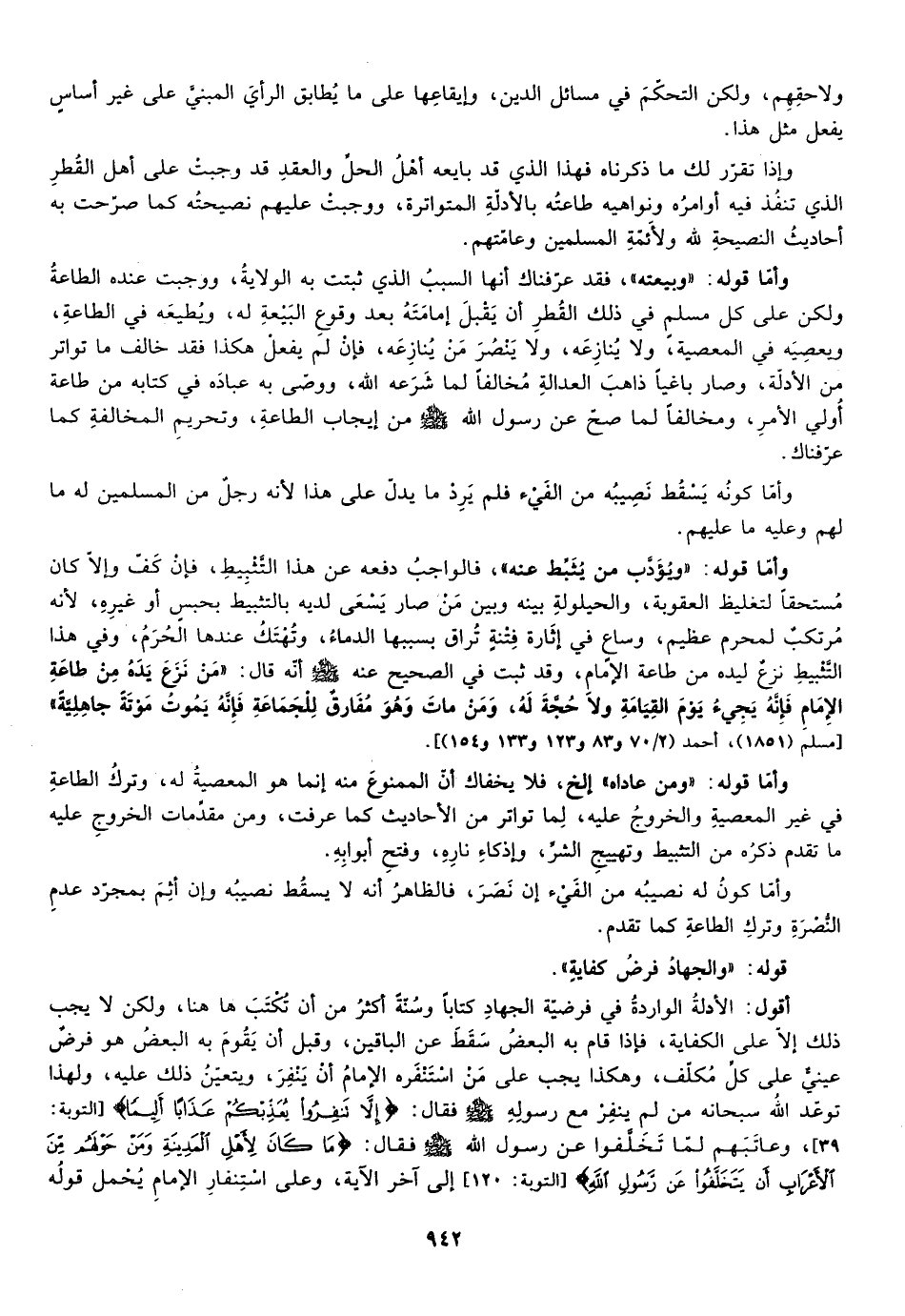 وإذا تقرر لك ما ذكرناه فهذا الذي قد بايعه أهل الحل والعقد قد وجبت على أهل القطر الذي تنفذ فيه أوامره ونواهيه طاعته بالأدلة المتواترة ووجبت عليهم نصيحته كما صرحت به أحاديث النصيحة لله ولأئمة المسلمين وعامتهم.