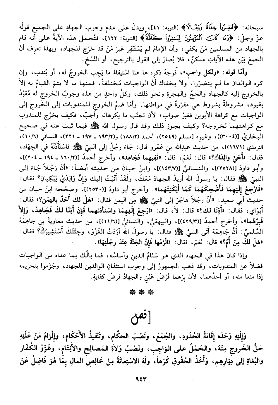 وأما قوله: "ولكل واجب" فوجه ذكره ها هنا استيفاء ما يجب الخروج له أو يندب وإن كره الولدان ما لم يتضررا ولا يخفاك أن الواجبات مختلفة فمنها ما لا يتم القيام به إلا بالخروج إليه كالجهاد والحج والهجرة ونحو ذلك وكل واحد من هذه وجوب الخورج له مقيد بقيود مشروطة بشروط هي مقررة في مواطنها وأما ضم الخروج للمندوبات إلى الخروج إلى الواجبات مع كراهة الأبوين فغير صواب لأن تجنب ما يكرهانه واجب فكيف يخرج للمندوب مع كراهتهما لخروجه وكيف يجوز ذلك وقد قال رسول الله صلى الله عليه وسلم فيما ثبت عنه في صحيح [البخاري "3004"، وغيره مسلم "2549"، أحمد "2/188، 2/193، 197، 221"، النسائي "6/10"، الترمذي "1671"] ، من حديث عبد الله بن عمرو قال: جاء رجل إلى النبي صلى الله عليه وسلم فاستأذنه في الجهاد فقال: "أحي والداك؟ "، قال: نعم قال: "ففيهما فجاهد"، وأخرج أحمد "2/160، 194، 204"، وأبو داود 2528"، والنسائي "7/143"،وابن حبان من حديثه أيضا أن رجلا جاء إلى النبي صلى الله عليه وسلم فقال يا رسول الله أريد الجهاد معك ولقد أتيت وإن والدي يبكيان, قال: "فارجع إليهما فأضحكهما كما أبكيتهما"، وأخرج أبو داود "2530"،وصححه ابن حبان من حديث أبي سعيد أن رجلا هاجر إلى النبي صلى الله عليه وسلم من اليمن فقال: "هل لك أحد باليمن؟ "، فقال: أبواي فقال: "أذنا لك"، قال: لا, قال: "ارجع إليهما فاستأذنهما فإن أذنا لك فجاهد وإلا فبرهما"، وأخرج أحمد "3/429"، والبيهقي والنسائي "6/11"، من حديث معاوية بن جاهمة السلمي أن جاهمة أتى النبي صلى الله عليه وسلم فقال: يا رسول الله أردت الغزو وجيئتك أستشيرك, فقال: "هل لك من أم؟ "، قال: نعم فقال: "الزمها فإن الجنة عند رجليها".