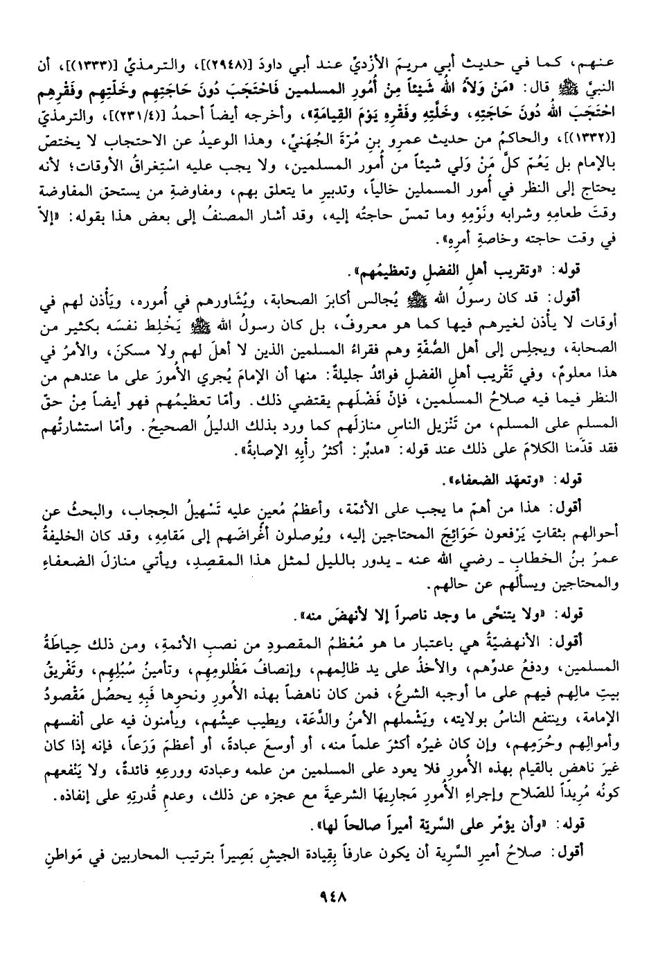أقول: هذا من أهم الواجبات على الأئمة وأعظم معين عليه تسهيل الحجاب والبحث عن أحوالهم بثقات يرفعون حوائج المحتاجين إليه ويوصلون أغراضهم إلى مقامه وقد كان الخليفة عمر بن الخطاب رضي الله عنه يدور بالليل لمثل هذا المقصد فيأتي منازل الضعفاء والمحتاجين ويسألهم عن حالهم.