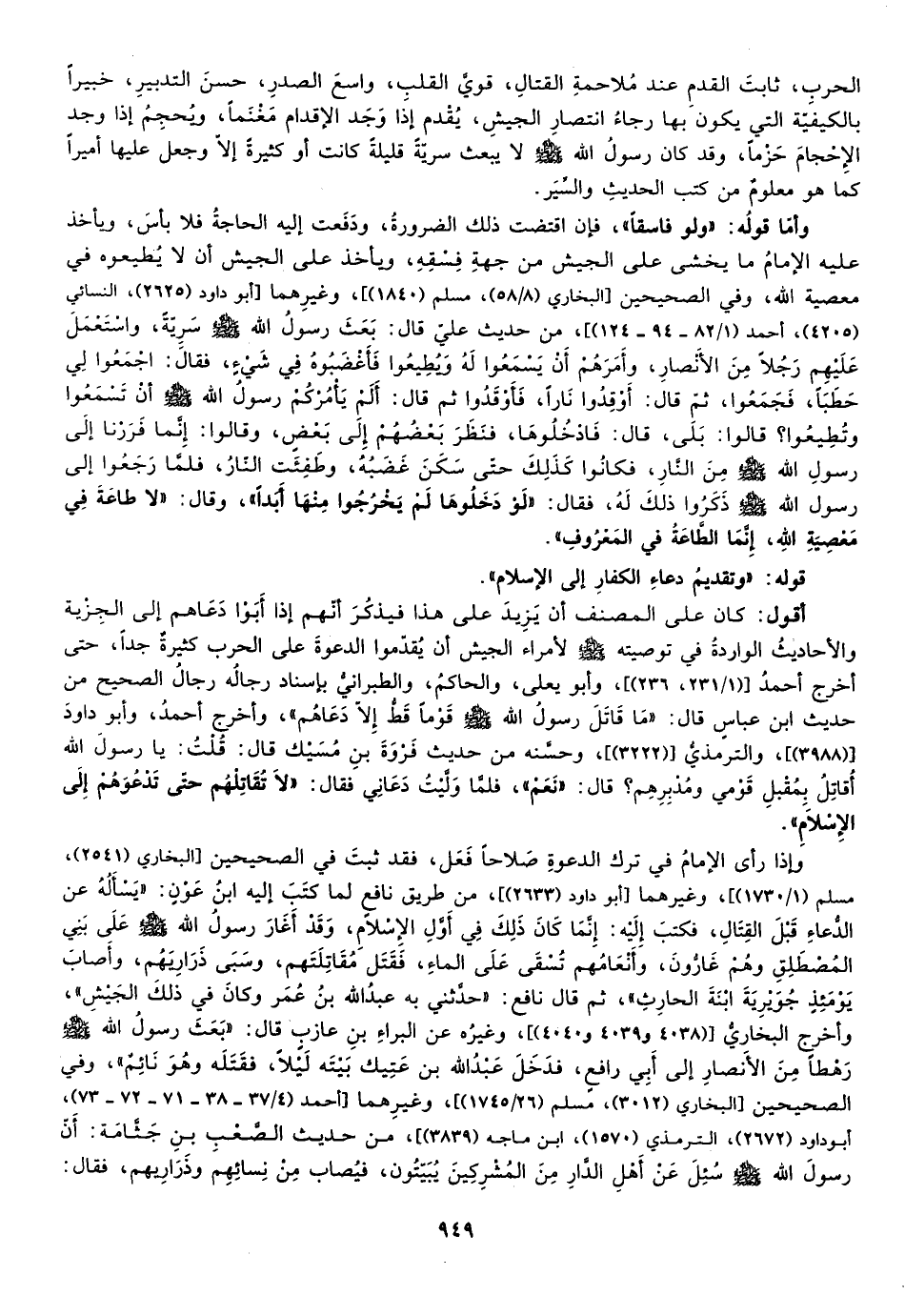 وإذا رأى الإمام في ترك الدعوة صلاحا فعل فقد ثبت في الصحيحين [البخاري "2541"، مسلم "1/1730"، وغيرهما أبو داود "2633"] ، من طريق نافع لما كتب إليه ابن عون يسأله عن الدعاء قبل القتال فكتب إليه إنما كان ذلك في أول الإسلام وقد أغار رسول الله صلى الله عليه وسلم على بني المصطلق وهم غارون وأنعامهم تسقى على الماء فقتل مقاتلتهم وسبى ذراريهم وأصاب يومئذ جويرية ابنة الحارث ثم قال نافع حدثني به عبد الله بن عمر وكان في ذلك الجيش وأخرج البخاري "4038، 4039، 4040"، وغيره عن البراء بن عازب قال بعث رسول الله صلى الله عليه وسلم رهطا من الأنصار إلى أبي رافع فدخل عبد الله بن عتيك بيته ليلا فقتله وهو نائم وفي الصحيحين [البخاري "3012"، مسلم "26/1745"، وغيرهما أحمد "4/38، 71، 72، 73"ن أبو داود "2672"، الترمذي "1570"، ابن ماجة "3839"] ، من حديث الصعب بن جثامة أن رسول الله صلى الله عليه وسلم سئل عن أهل الدار من المشركين يبيتون فيصاب من نسائهم وذراريهم فقال: