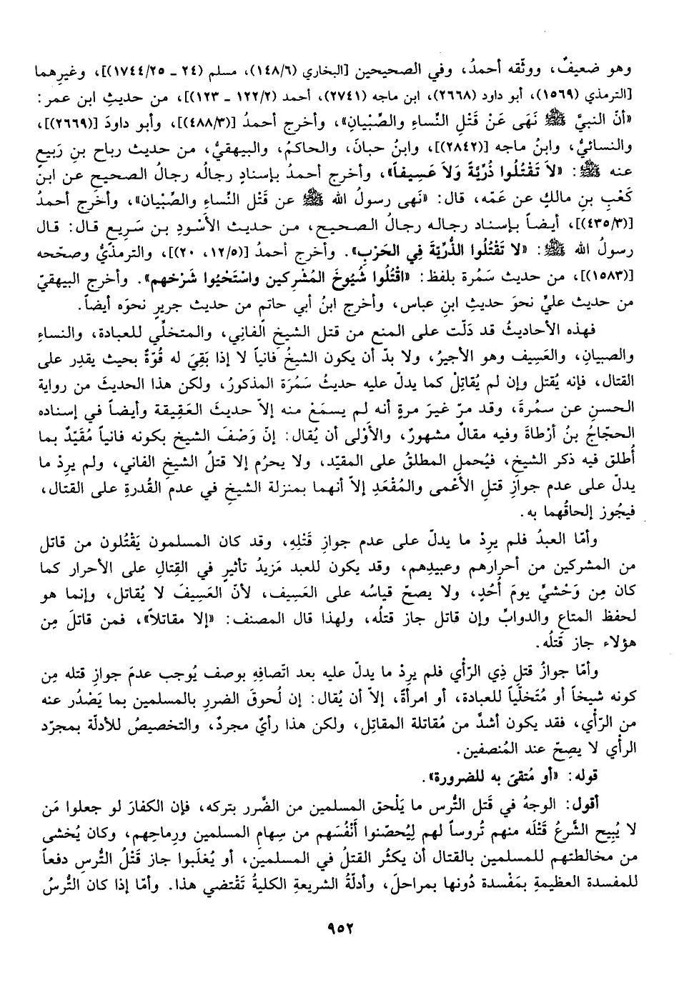 فهذه الأحاديث قد دلت على المنع من قتل الشيخ الفاني والمتخلي للعبادة والنساء والصبيان والعسيف وهو الأجير ولا بد أن يكون الشيخ فانيا لا إذا بقي له قوة بحيث يقدر على القتال فإنه يقتل وإن لم يقاتل كما يدل عليه حديث سمرة المذكور ولكن هذا الحديث من رواية الحسن عن سمرة وقد مر غير مرة أنه لم يسمع منه إلا حديث العقيقة وأيضا في إسناده الحجاج بن أرطاة وفيه مقال مشهور والأولى أن يقال إن وصف الشيخ بكونه فانيا مقيد بما أطلق فيه ذكر الشيخ فيحمل المطلق على المقيد ولا يحرم إلا قتل الشيخ الفاني ولم يرد ما يدل على عدم جواز قتل الأعمى والمقعد إلا أنهما بمنزلة الشيخ في عدم القدرة على القتال فيجوز إلحاقهما به.