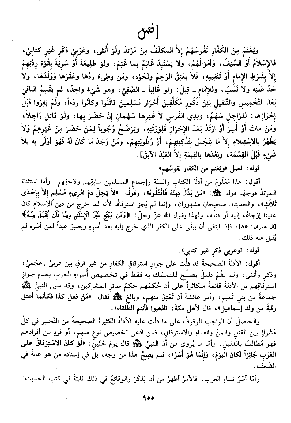 والحاصل أن الواجب الوقوف على ما دلت عليه الأدلة الكثيرة الصحيحة من التخيير في كل مشرك بين القتل والمن والفداء والاسترقاق فمن ادعى تخصيص نوع منهم أو فرد من أفرادهم فهو مطالب بالدليل وأما ما يروى من أن النبي صلى الله عليه وسلم قال يوم حنين: "لو كان الاسترقاق على العرب جائزا لكان اليوم وإنما هو أسر"، فلم يصح هذا من وجه بل في إسناده من هو غاية في الضعف".