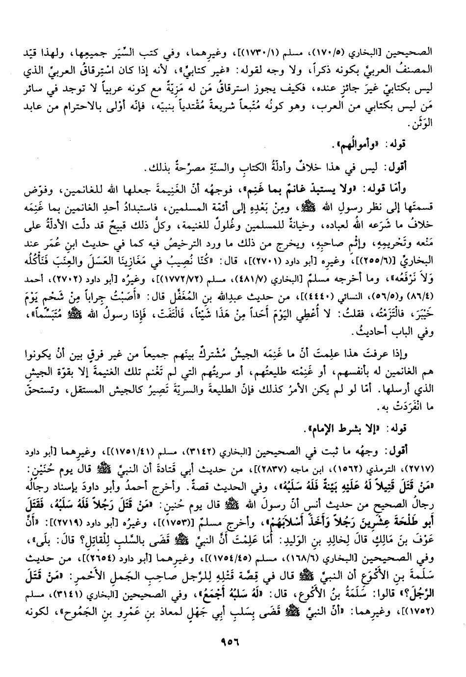 أقول: وجهه ما ثبت في الصحيحين [البخاري "3142"، مسلم "1751"، بوغيرهما أبو داود "2717"، الترمذي "1562"، ابن ماجة "2837"] ، من حديث أبي قتادة أن النبي صلى الله عليه وسلم قال يوم حنين: "من قتل قتيلا له عليه بينة فله سلبه"، وفي الحديث قصة وأخرج أحمد وأبو داود بإسناد رجاله رجال الصحيح من حديث أنس أن رسول الله صلى الله عليه وسلم قال يوم حنين: "من قتل رجلا فله سلبه" فقتل أبو طلحة عشرين رجلا وأخذ أسلابهم، وأخرج مسلم ["1753"، وغيره أبو داود "2719"] ، أن عوف بن مالك قال لخالد بن الوليد أما علمت أن النبي صلى الله عليه وسلم قضى بالسلب للقاتل قال: بلى وفي الصحيحين [البخاري "6/168"، مسلم "45/1754"، وغيرهما أبو داود "2654"] ، من حديث سلمة بن الأكوع أن النبي صلى الله عليه وسلم قال في قصة قتله للرجل صاحب الجمل الأحمر: "من قتل الرجل؟ " قالوا: سلمة بن الأكوع, قال: "له سلبه أجمع" وفي الصحيحين [البخاري "3141"، مسلم "1752"] ، وغيرهما أن النبي صلى الله عليه وسلم قضى بسلب أبي جهل لمعاذ بن عمرو بن الجموح لكونه