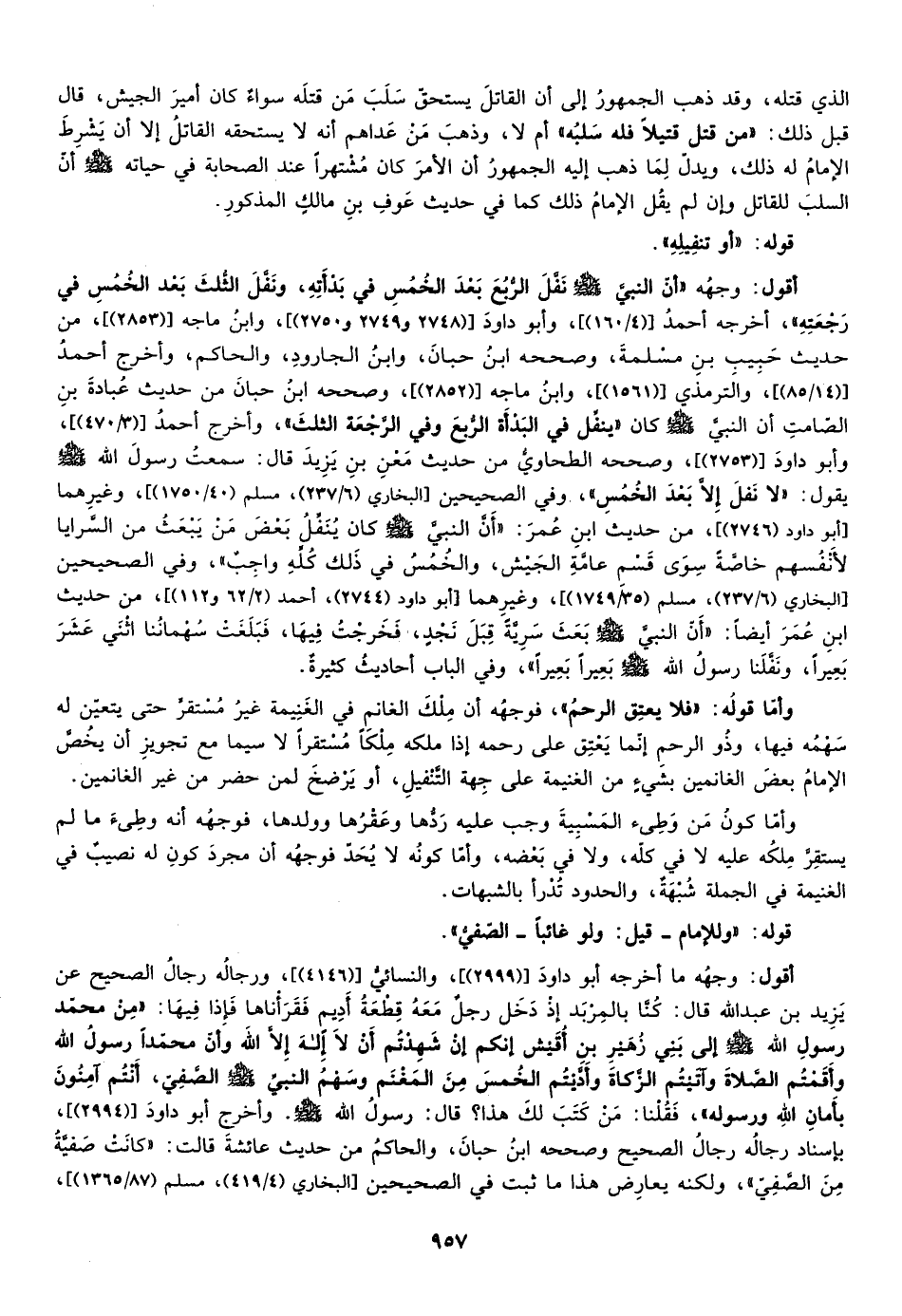أقول: وجهه أن النبي صلى الله عليه وسلم نفل الربع بعد الخمس في بدأته ونفل الثلث بعد الخمس في رجعته أخرجه أحمد "4/160"، وأبو داود "2748، 2749، 2750"، وابن ماجه "2853"، من حديث حبيب بن مسلمة وصححه ابن حبان وابن الجارود والحاكم وأخرج أحمد "3/470"، وابن ماجه "2753"، وصححه ابن حبان من حديث عبادة بن الصامت أن النبي صلى الله عليه وسلم كان ينفل في البدأة والربع وفي الرجعة الثلث وأخرج أحمد وأبو داود وصححه الطحاوي من حديث معن بن يزيد قال سمعت رسول الله صلى الله عليه وسلم يقول: "لا نفل إلا بعد الخمس"، وفي الصحيحين [البخاري "6/237"، مسلم "40/1750"، وغيرهما أبو داود "2746"] ، من حديث ابن عمر أن النبي صلى الله عليه وسلم كان ينفل بعض من يبعث من السرايا لأنفسهم خاصة سوى قسم عامة الجيش والخمس في ذلك كله واجب وفي الصحيحين [البخاري "6/237"، مسلم "35/1749"، وغيرهما أبو داود "2744"، أحمد "2/62، 112"] ، من حديث ابن عمر أيضا أن النبي صلى الله عليه وسلم بعث سرية قبل نجد فخرجت فيها فبلغت سهماننا أثنى عشر بعيرا ونفلنا صلى الله عليه وسلم بعيرا بعيرا وفي الباب أحاديث كثيرة.
