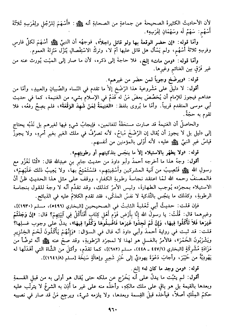 والحاصل أن الغنيمة قد صارت مستحقة للغانمين فإيجاب شيء فيها لغيرهم بل ندبه يحتاج إلى دليل بل لا يجوز أن يقال إن الرضح مباح لأنه تصرف في ملك الغير بغير أمره ولايجوز قياس غير النبي صلى الله عليه وسلم عليه لأنه أولى بالمؤمنين من أنفسهم.