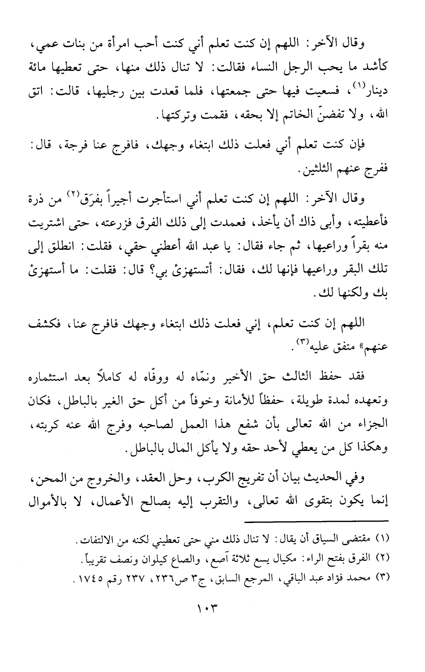 وقال الآخر: اللهم إن كنت تعلم أني كنت أحب امرأة من بنات عمي، كأشد ما يحب الرجل النساء فقالت: لا تنال ذلك منها، حتى تعطيها مائة دينار (¬1)، فسعيت فيها حتى جمعتها، فلما قعدت بين رجليها، قالت: اتق الله، ولا تفضن الخاتم إلا بحقه، فقمت وتركتها.