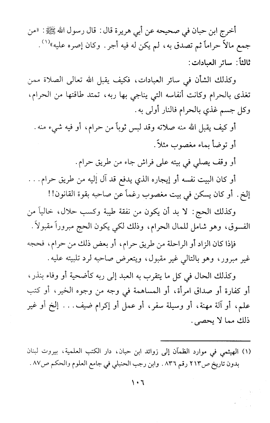 وكذلك الشأن في سائر العبادات، فكيف يقبل الله تعالى الصلاة ممن تغذى بالحرام وكانت أنفاسه التي يناجي بها ربه، تمتد طاقتها من الحرام، وكل جسم غذي بالحرام فالنار أولى به.