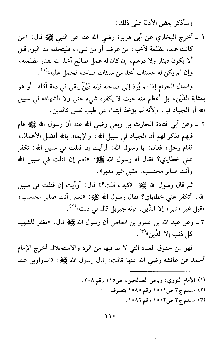 3 - وعن عبد الله بن عمرو بن العاص أن رسول الله - صلى الله عليه وسلم - قال: «يغفر للشهيد كل ذنب إلا الدين» (¬3).