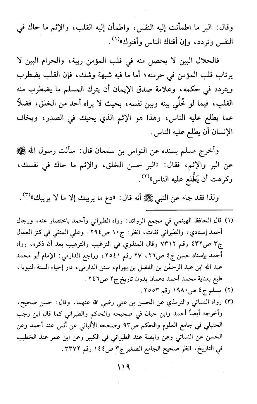 (¬3) رواه النسائي والترمذي عن الحسن بن علي رضي الله عنهما، وقال: حسن صحيح، وأخرجه أيضا أحمد وابن حبان في صحيحه والحاكم والطبراني كما قال ابن رجب الحنبلي في جامع العلوم والحكم ص 93 وصححه الألباني عن أنس عند أحمد وعن الحسن عن النسائي وعن وابصة عند الطبراني في الكبير وعن ابن عمر عند الخطيب في التاريخ، انظر صحيح الجامع الصغير ج 3 ص 144 رقم 3372.