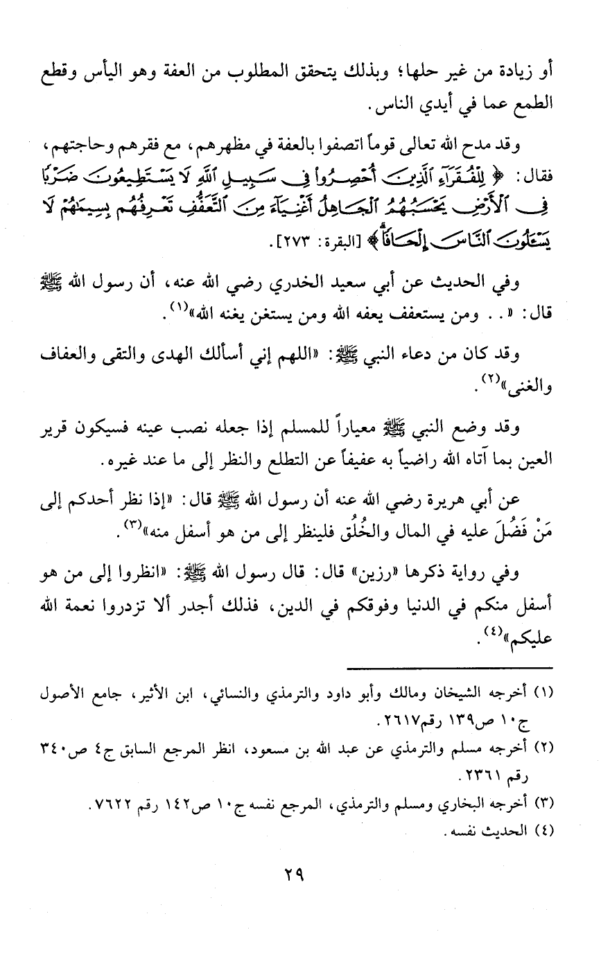 وفي الحديث عن أبي سعيد الخدري - رضي الله عنه -، أن رسول الله - صلى الله عليه وسلم - قال: ... «.. ومن يستعفف يعفه الله ومن يستغن يغنه الله» (¬1).
