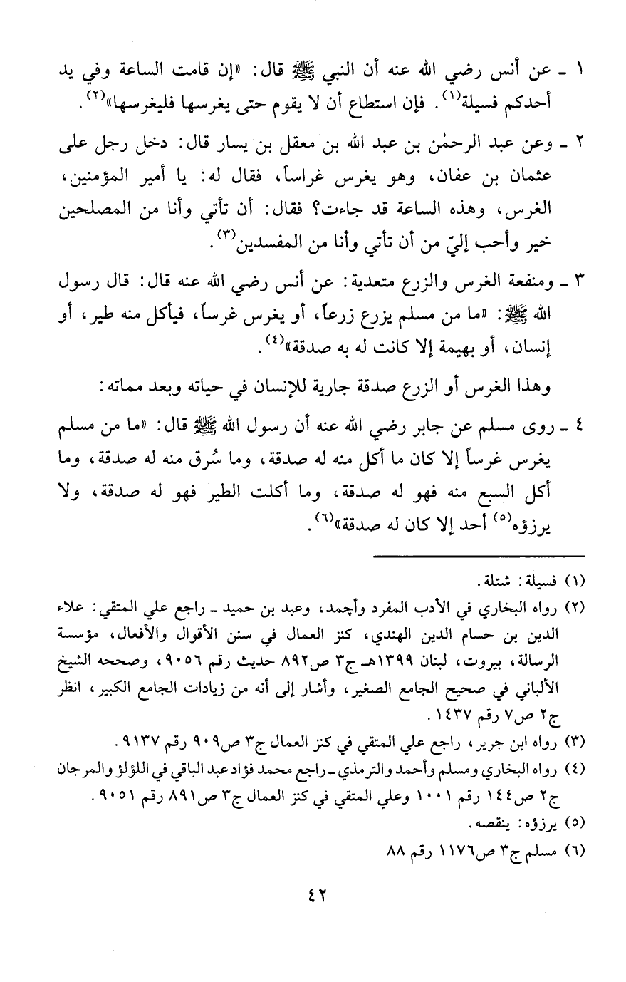 1 - عن أنس - رضي الله عنه - أن النبي - صلى الله عليه وسلم - قال: «إن قامت الساعة وفي يد أحدكم فسيلة (¬1). فإن استطاع أن لا يقوم حتى يغرسها فليغرسها» (¬2).