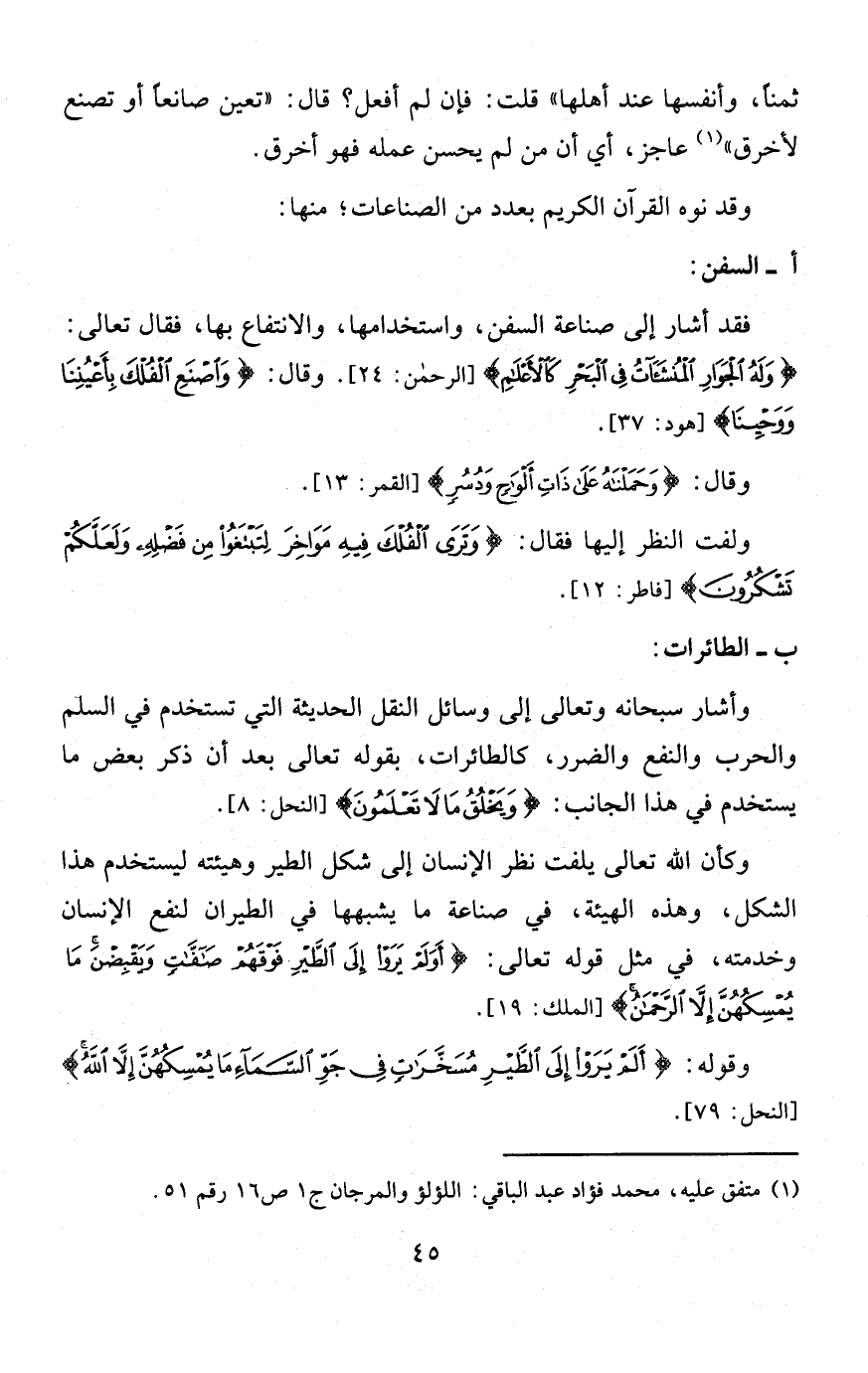 فقد أشار إلى صناعة السفن، واستخدامها، والانتفاع بها، فقال تعالى: {وَلَهُ الْجَوَارِي الْمُنْشَآتُ فِي الْبَحْرِ كَالْأَعْلَامِ} [الرحمن: 24]. وقال: {وَاصْنَعِ الْفُلْكَ بِأَعْيُنِنَا وَوَحْيِنَا} [هود: 37].