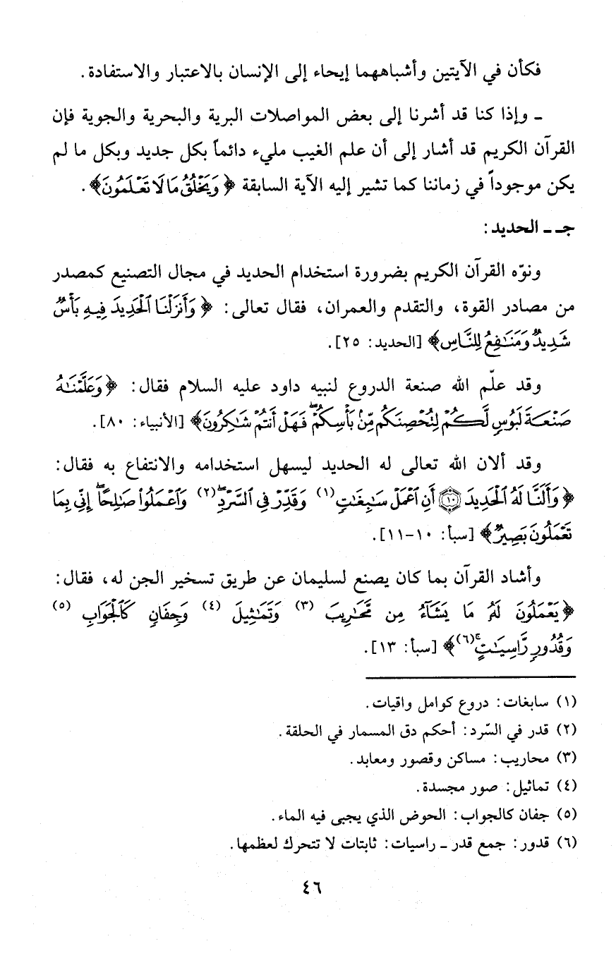 وأشاد القرآن بما كان يصنع لسليمان عن طريق تسخير الجن له، فقال: {يَعْمَلُونَ لَهُ مَا يَشَاءُ مِنْ مَحَارِيبَ (¬3) وَتَمَاثِيلَ (¬4) وَجِفَانٍ كَالْجَوَابِ (¬5) وَقُدُورٍ رَاسِيَاتٍ (¬6)} [سبأ: 13].