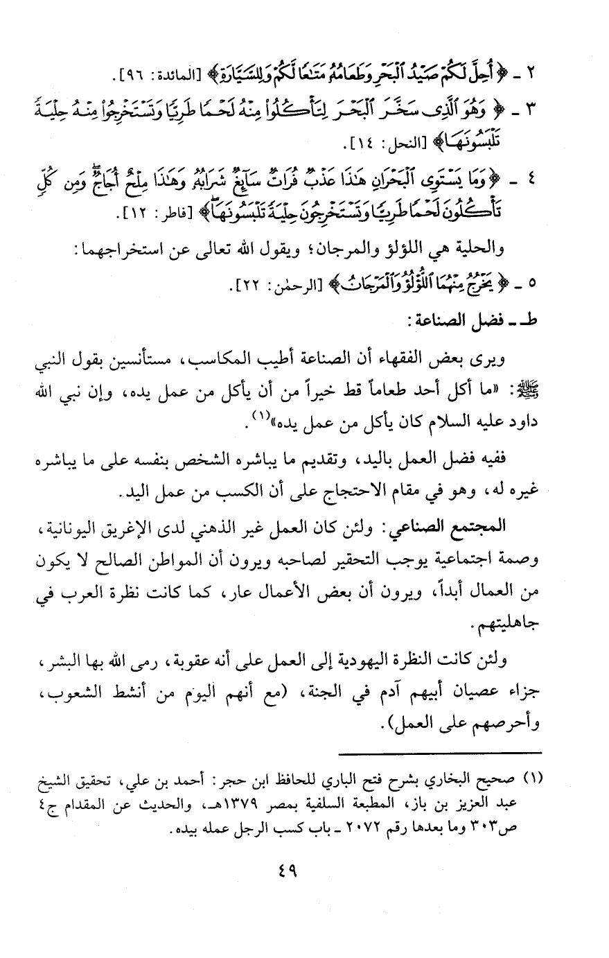 (¬1) صحيح البخاري بشرح فتح الباري للحافظ ابن حجر: أحمد بن علي، تحقيق الشيخ عبد العزيز بن باز، المطبعة السلفية بمصر 1379 هـ، والحديث عن المقدام ج 4 ص 303 وما بعدها رقم 2072 - باب كسب الرجل عمله بيده.