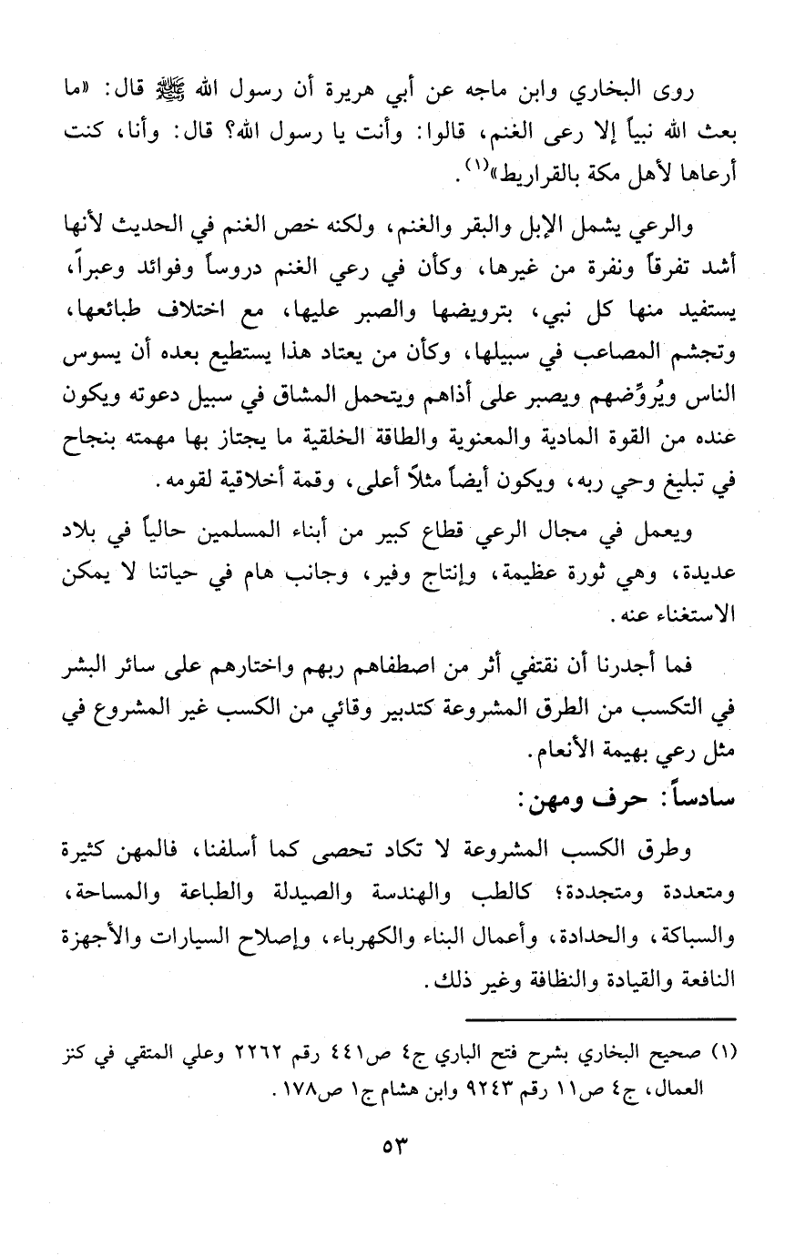 روى البخاري وابن ماجه عن أبي هريرة أن رسول الله - صلى الله عليه وسلم - قال: «ما بعث الله نبياً إلا رعى الغنم، قالوا: وأنت يا رسول الله؟ قال: وأنا، كنت أرعاها لأهل مكة بالقراريط» (¬1).