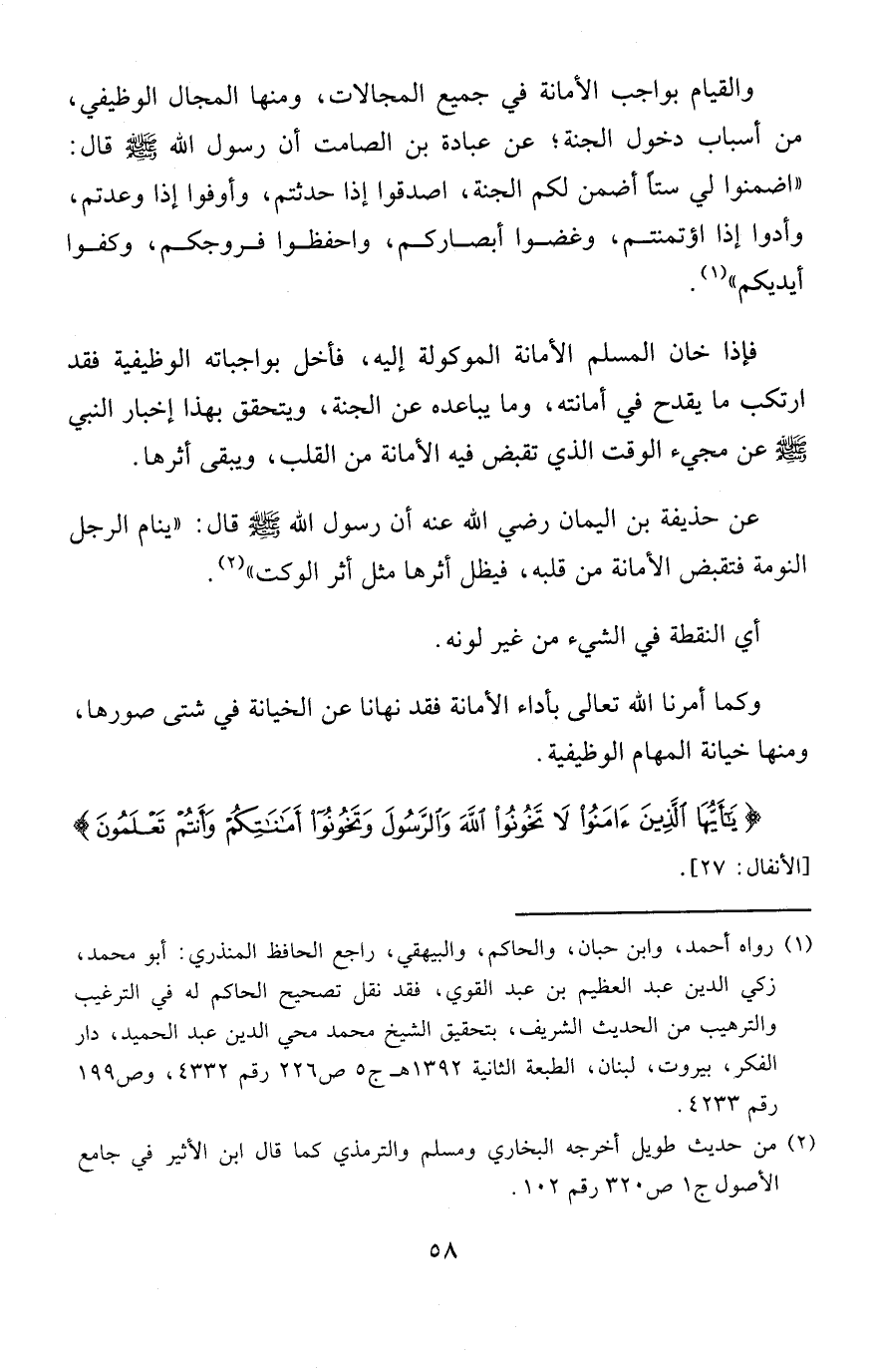 (¬1) رواه أحمد، وابن حبان، والحاكم، والبيهقي، راجع الحافظ المنذري: أبو محمد زكي الدين عبد العظيم بن عبد القوي، فقد نقل تصحيح الحاكم له في الترغيب والترهيب من الحديث الشريف، بتحقيق الشيخ محمد محي الدين عبد الحميد، دار الفكر، بيروت، لبنان، الطبعة الثانية 1392 هـ ج 5 ص 226 رقم 4332، وص199 رقم 4233.