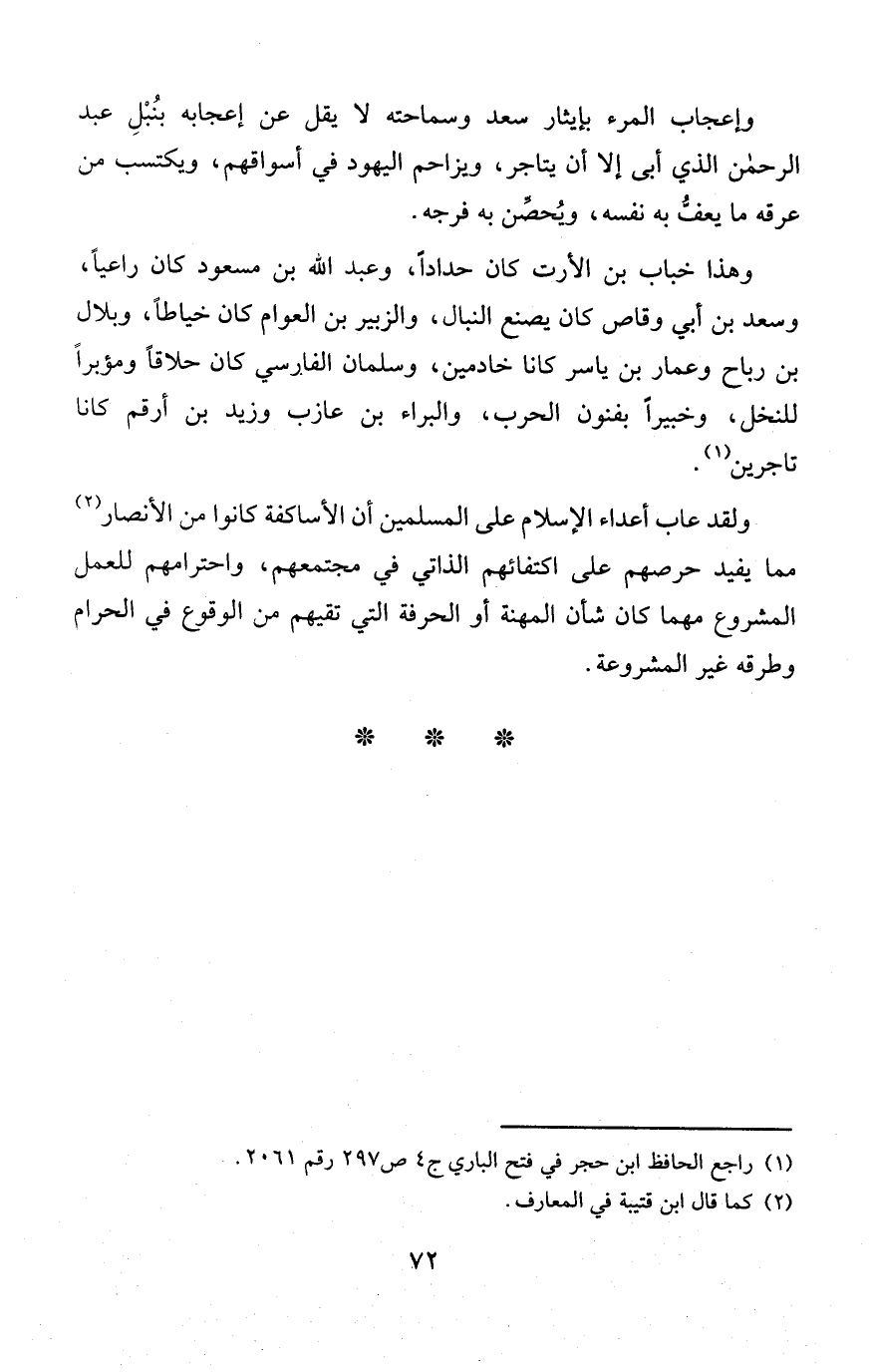 ولقد عاب أعداء الإسلام على المسلمين أن الأساكفة كانوا من الأنصار (¬2) مما يفيد حرصهم على اكتفائهم الذاتي في مجتمعهم، واحترامهم للعمل المشروع مهما كان شأن المهنة أو الحرفة التي تقيهم من الوقوع في الحرام وطرقه غير المشروعة.
