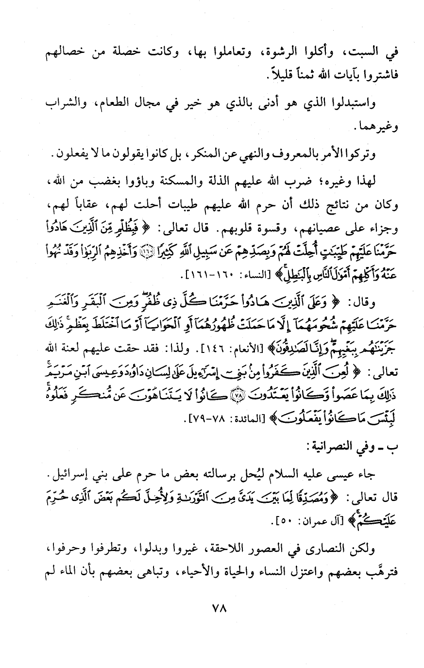 وقال: {وَعَلَى الَّذِينَ هَادُوا حَرَّمْنَا كُلَّ ذِي ظُفُرٍ وَمِنَ الْبَقَرِ وَالْغَنَمِ حَرَّمْنَا عَلَيْهِمْ شُحُومَهُمَا إِلَّا مَا حَمَلَتْ ظُهُورُهُمَا أَوِ الْحَوَايَا أَوْ مَا اخْتَلَطَ بِعَظْمٍ ذَلِكَ جَزَيْنَاهُمْ بِبَغْيِهِمْ وَإِنَّا لَصَادِقُونَ} [الأنعام: 146]. ولذا: فقد حقت عليهم لعنة الله تعالى: {لُعِنَ الَّذِينَ كَفَرُوا مِنْ بَنِي إِسْرَائِيلَ عَلَى لِسَانِ دَاوُدَ وَعِيسَى ابْنِ مَرْيَمَ ذَلِكَ بِمَا عَصَوْا وَكَانُوا يَعْتَدُونَ * كَانُوا لَا يَتَنَاهَوْنَ عَنْ مُنْكَرٍ فَعَلُوهُ لَبِئْسَ مَا كَانُوا يَفْعَلُونَ} [المائدة: 78 - 79].
