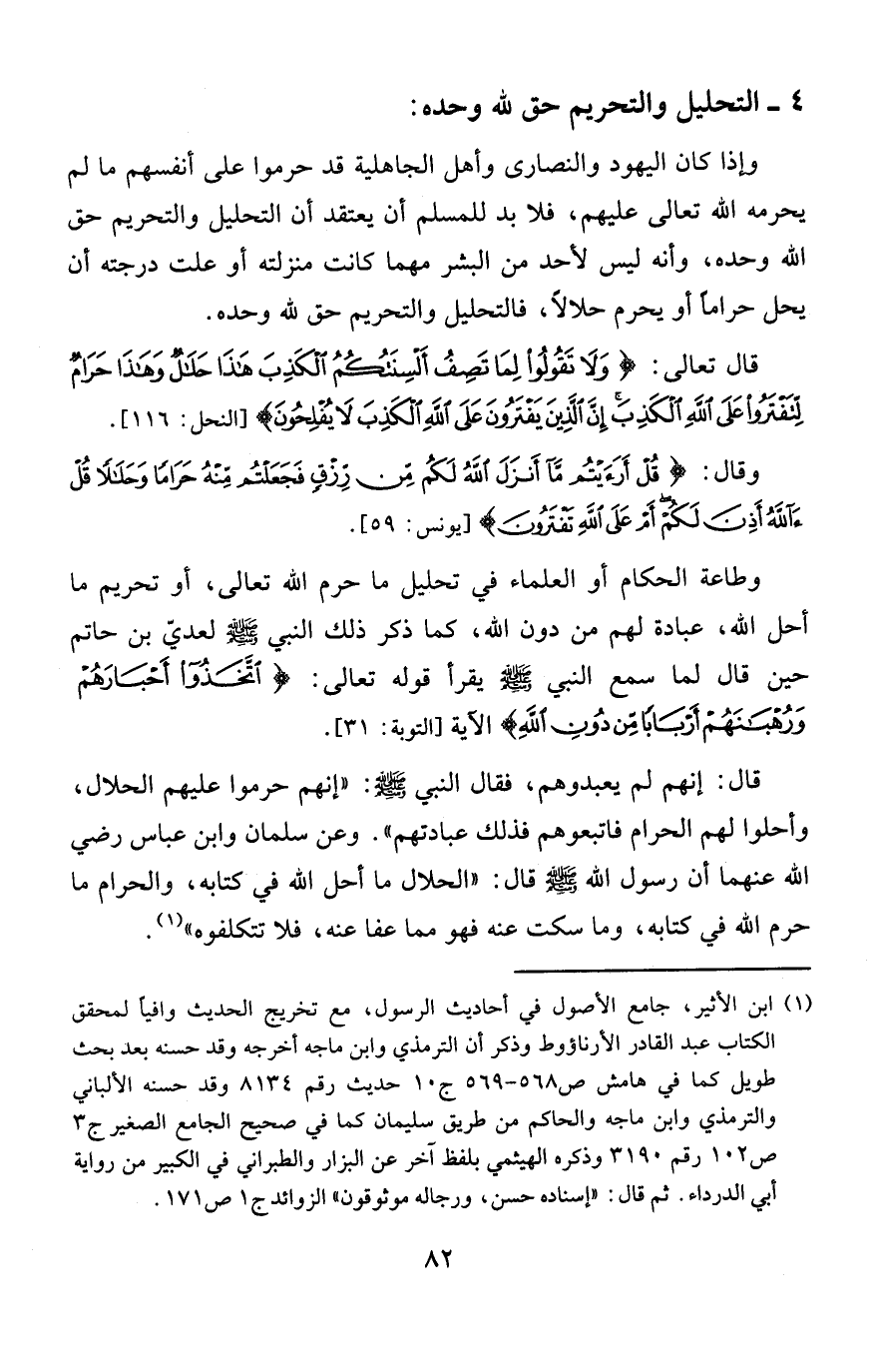وطاعة الحكام أو العلماء في تحليل ما حرم الله تعالى، أو تحريم ما أحل الله، عبادة لهم من دون الله، كما ذكر ذلك النبي - صلى الله عليه وسلم - لعدي بن حاتم حين قال لما سمع النبي - صلى الله عليه وسلم - يقرأ قوله تعالى: {اتَّخَذُوا أَحْبَارَهُمْ وَرُهْبَانَهُمْ أَرْبَابًا مِنْ دُونِ اللَّهِ} الآية [التوبة: 31].