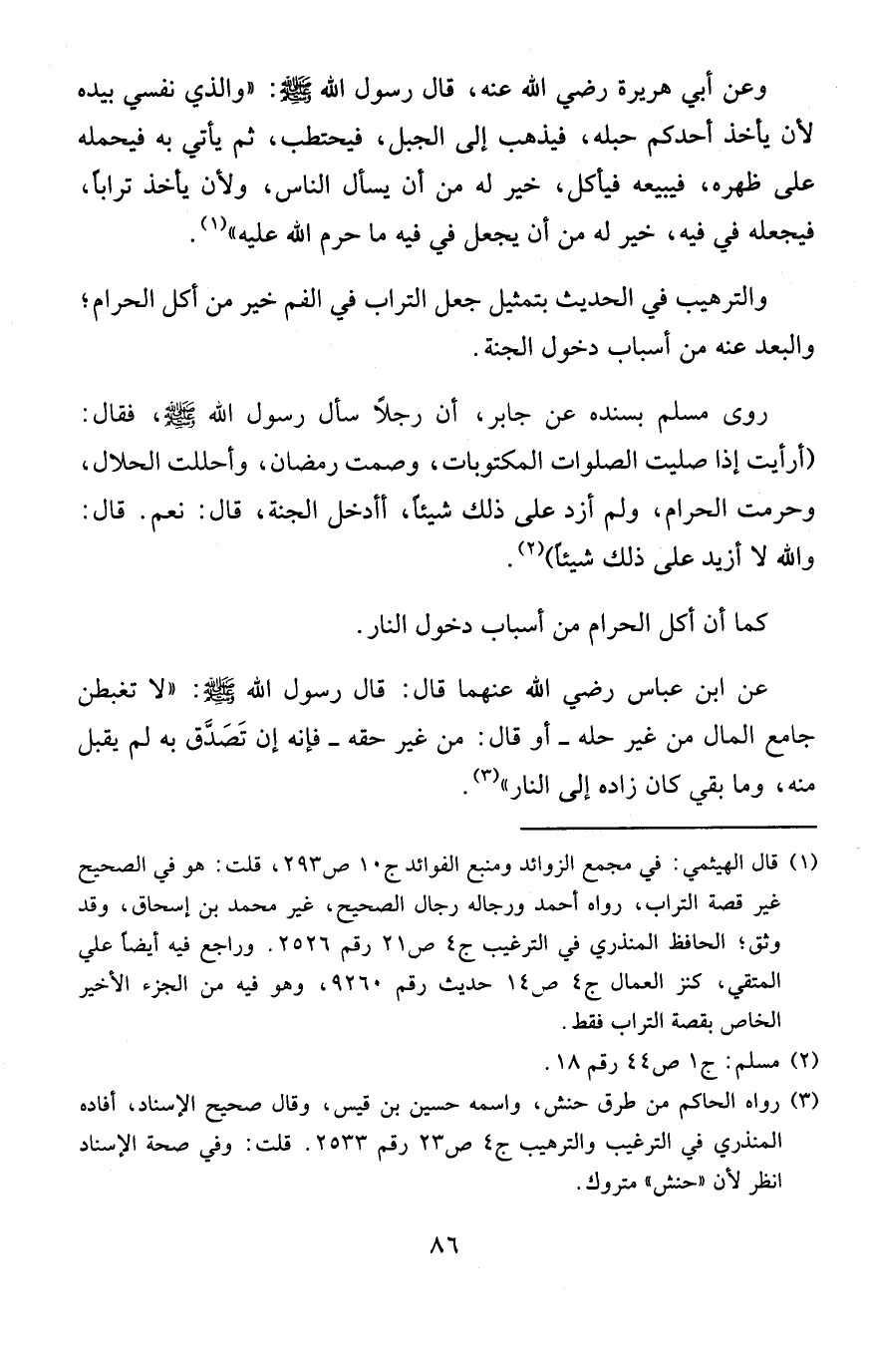 وعن أبي هريرة - رضي الله عنه -، قال رسول الله - صلى الله عليه وسلم -: «والذي نفسي بيده لأن يأخذ أحدكم حبله، فيذهب إلى الجبل، فيحتطب، ثم يأتي به فيحمله على ظهره، فيبيعه فيأكل، خير له من أن يسأل الناس، ولأن يأخذ تراباً، فيجعله في فيه، خير له من أن يجعل في فيه ما حرم الله عليه» (¬1).