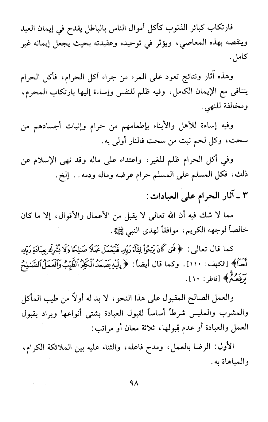 والعمل الصالح المقبول على هذا النحو، لا بد له أولاً من طيب المأكل والمشرب والملبس شرطاً أساساً لقبول العبادة بشتى أنواعها ويراد بقبول العمل والعبادة أو عدم قبولها، ثلاثة معان أو مراتب: