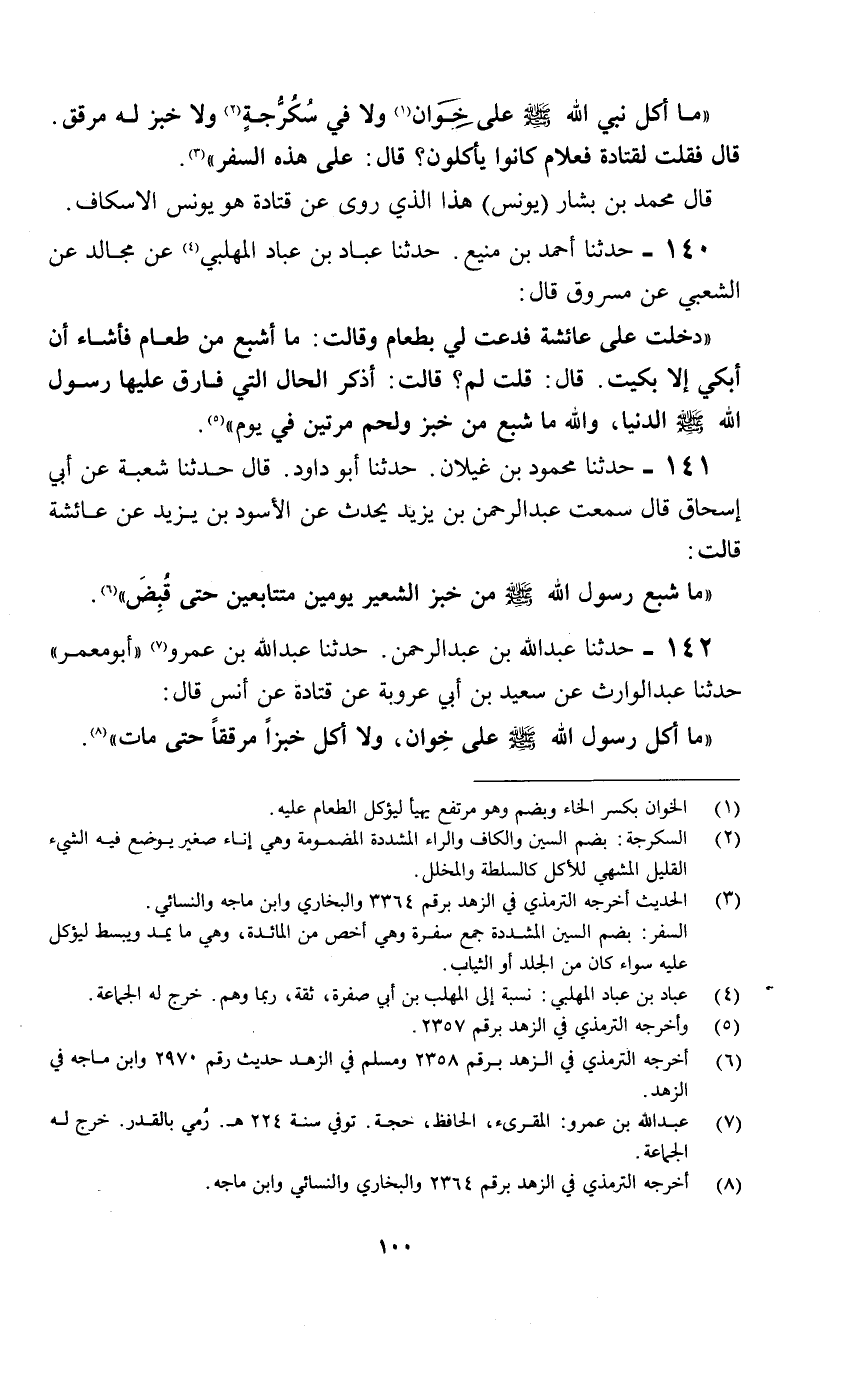 (3) الحديث أخرجه الترمذي في الزهد برقم 3364 والبخاري وابن ماجه والنسائي. السفر: بضم السين المشددة جمع سفرة وهي أخص من المائدة، وهي ما يمد ويبسط ليؤكل عليه سواء كان من الجلد أو الثياب.