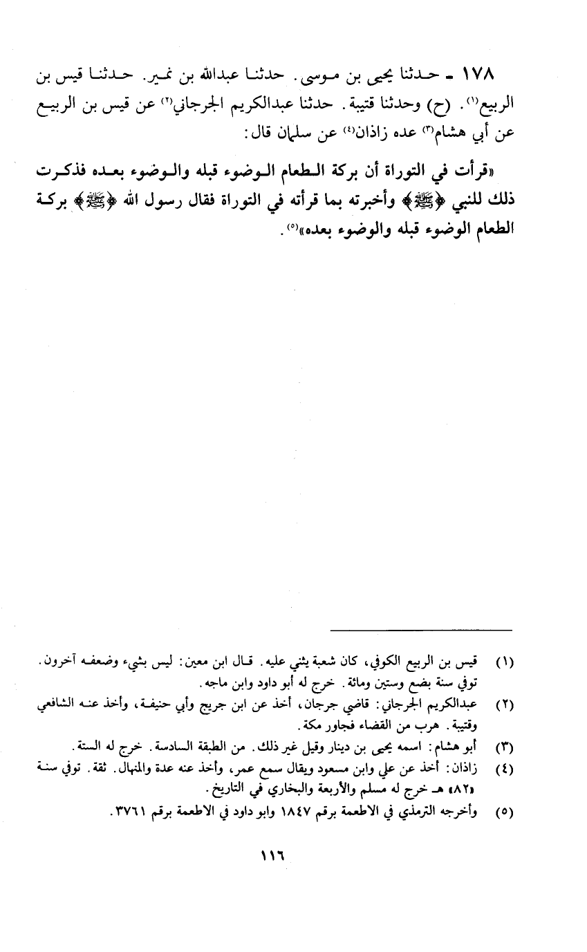 178- حدثنا يحيى بن موسى. حدثنا عبد الله بن نمير. حدثنا قيس بن الربيع «1» . (ح) وحدثنا قتيبة. حدثنا عبد الكريم الجرجاني «2» عن قيس بن الربيع عن أبي هشام «3» عده زاذان «4» عن سلمان قال: