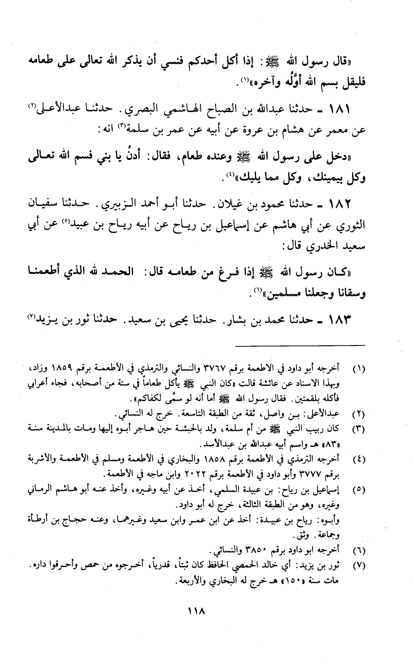 (4) أخرجه الترمذي في الأطعمة برقم 1858 والبخاري في الأطعمة ومسلم في الأطعمة والأشربة برقم 3777 وأبو داود في الأطعمة برقم 2022 وابن ماجه في الأطعمة.