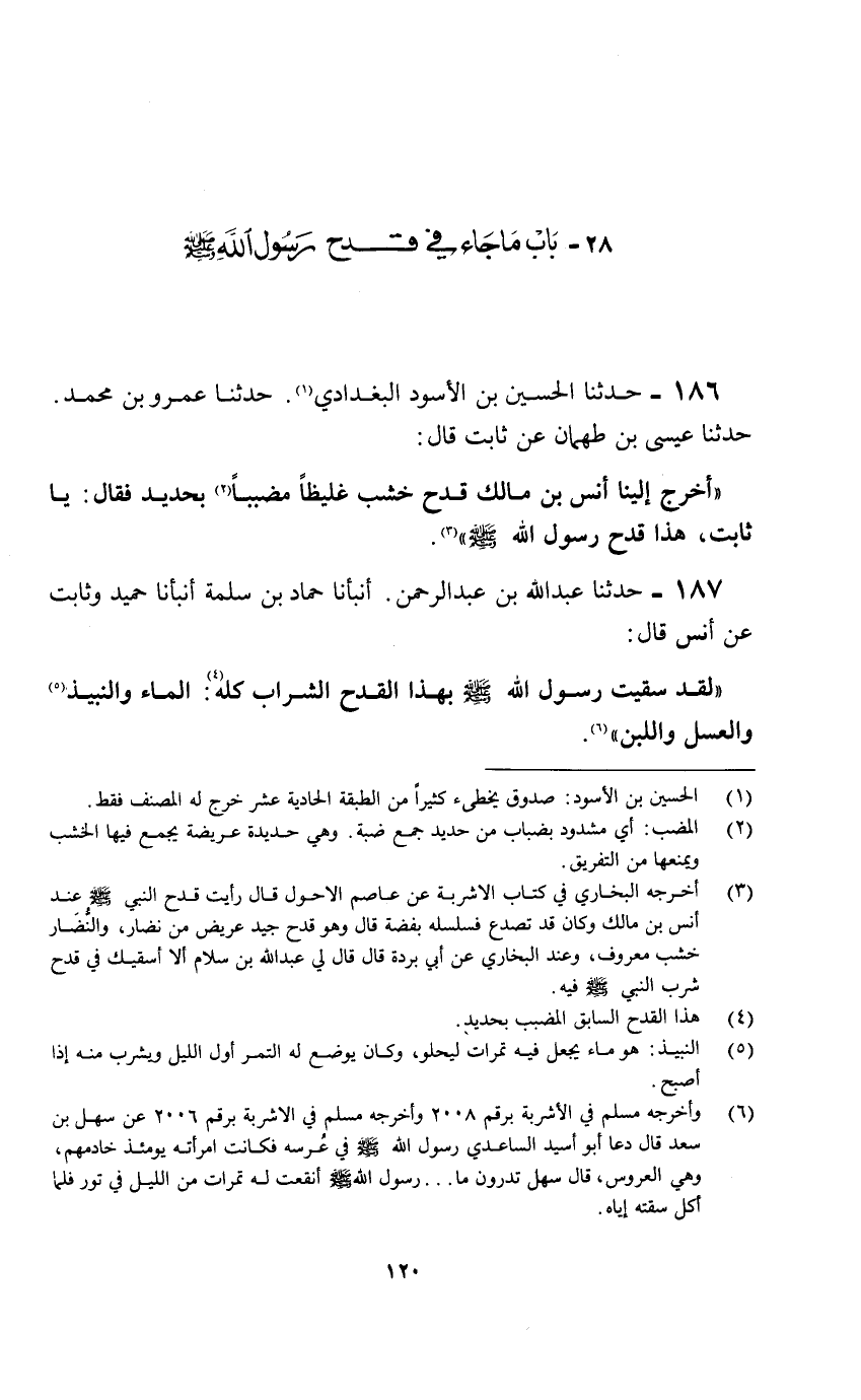 (3) أخرجه البخاري في كتاب الاشربة عن عاصم الاحول قال رأيت قدح النبي صلى الله عليه وسلم عند أنس بن مالك وكان قد تصدع فسلسله بفضة قال وهو قدح جيد عريض من نضار، والنّضار خشب معروف، وعند البخاري عن أبي بردة قال قال لي عبد الله بن سلام ألا أسقيك في قدح شرب النبي صلى الله عليه وسلم فيه.