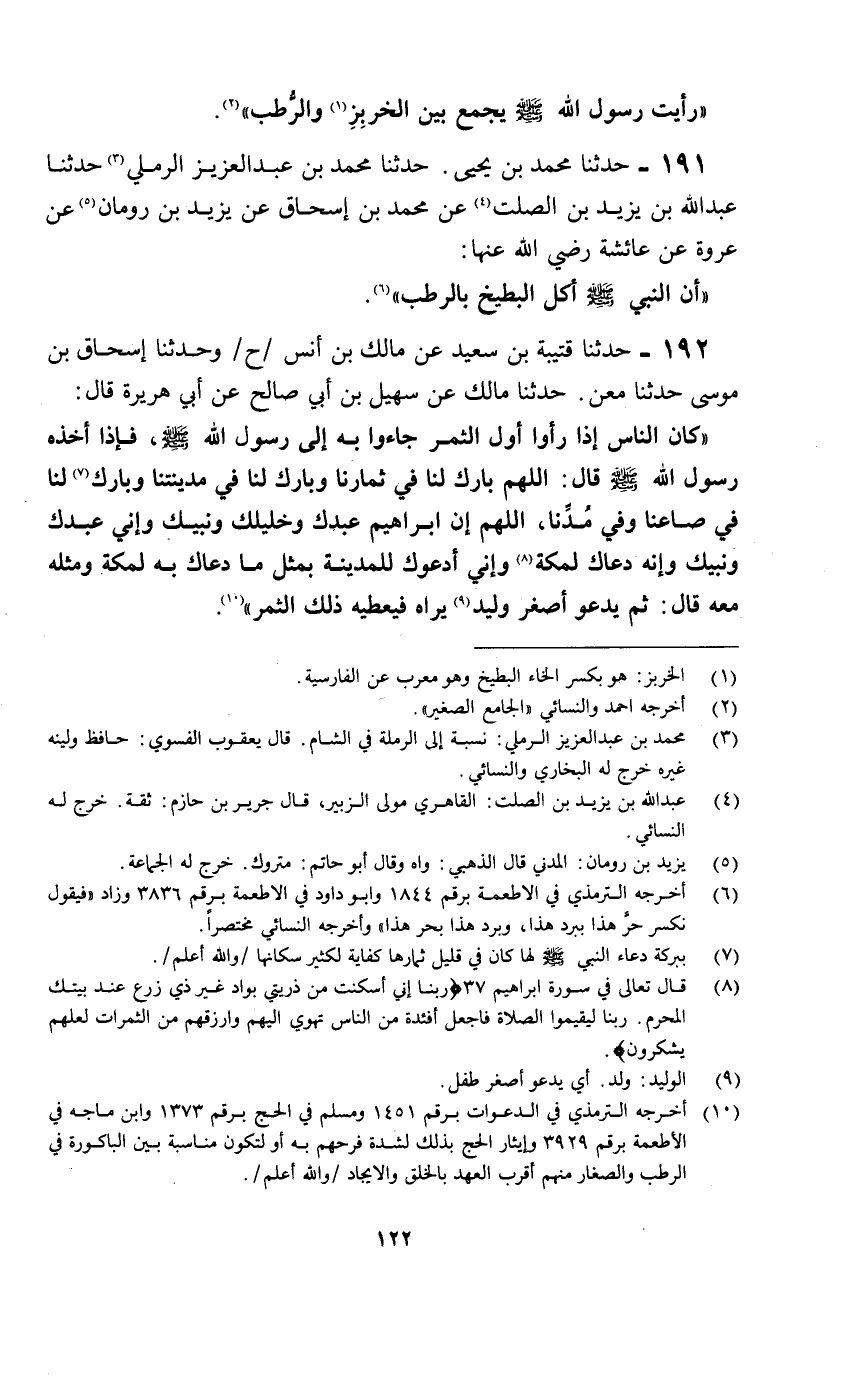(10) أخرجه الترمذي في الدعوات برقم 1451 ومسلم في الحج برقم 1373 وابن ماجه في الأطعمة برقم 3929 وإيثار الحج بذلك لشدة فرحهم به أو لتكون مناسبة بين الباكورة في الرطب والصغار منهم أقرب العهد بالخلق والايجاد/ والله أعلم/.
