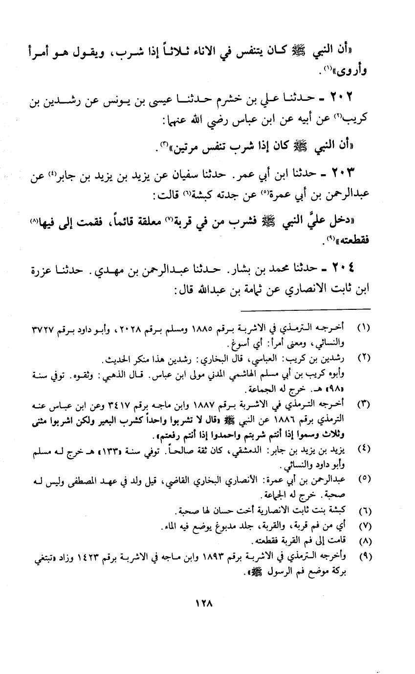 (3) أخرجه الترمذي في الاشربة برقم 1887 وابن ماجه برقم 3417 وعن ابن عباس عنه الترمذي برقم 1886 عن النبي صلى الله عليه وسلم «قال لا تشربوا واحدا كشرب البعير ولكن اشربوا مثنى وثلاث وسموا إذا أنتم شربتم واحمدوا إذا أنتم رفعتم» .