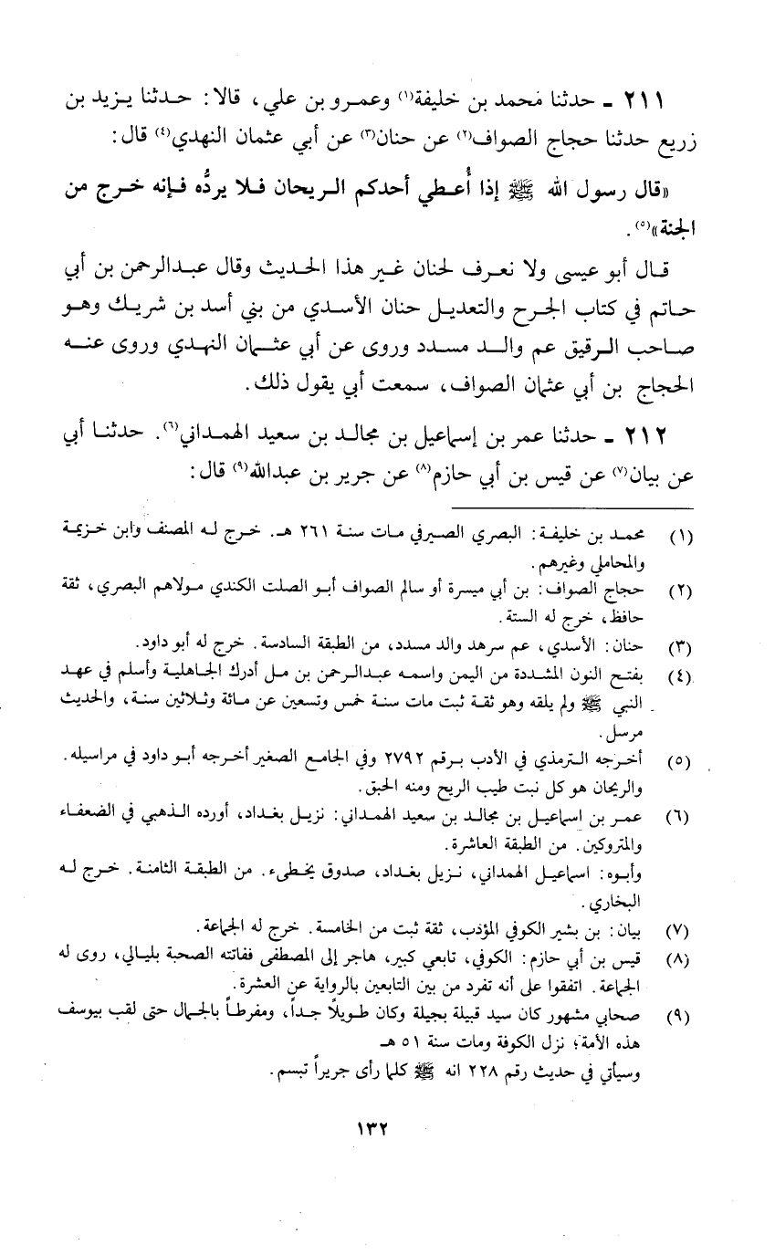211- حدثنا محمد بن خليفة «1» وعمرو بن علي، قالا: حدثنا يزيد بن زريع حدثنا حجاج الصواف «2» عن حنان «3» عن أبي عثمان النهدي «4» قال: